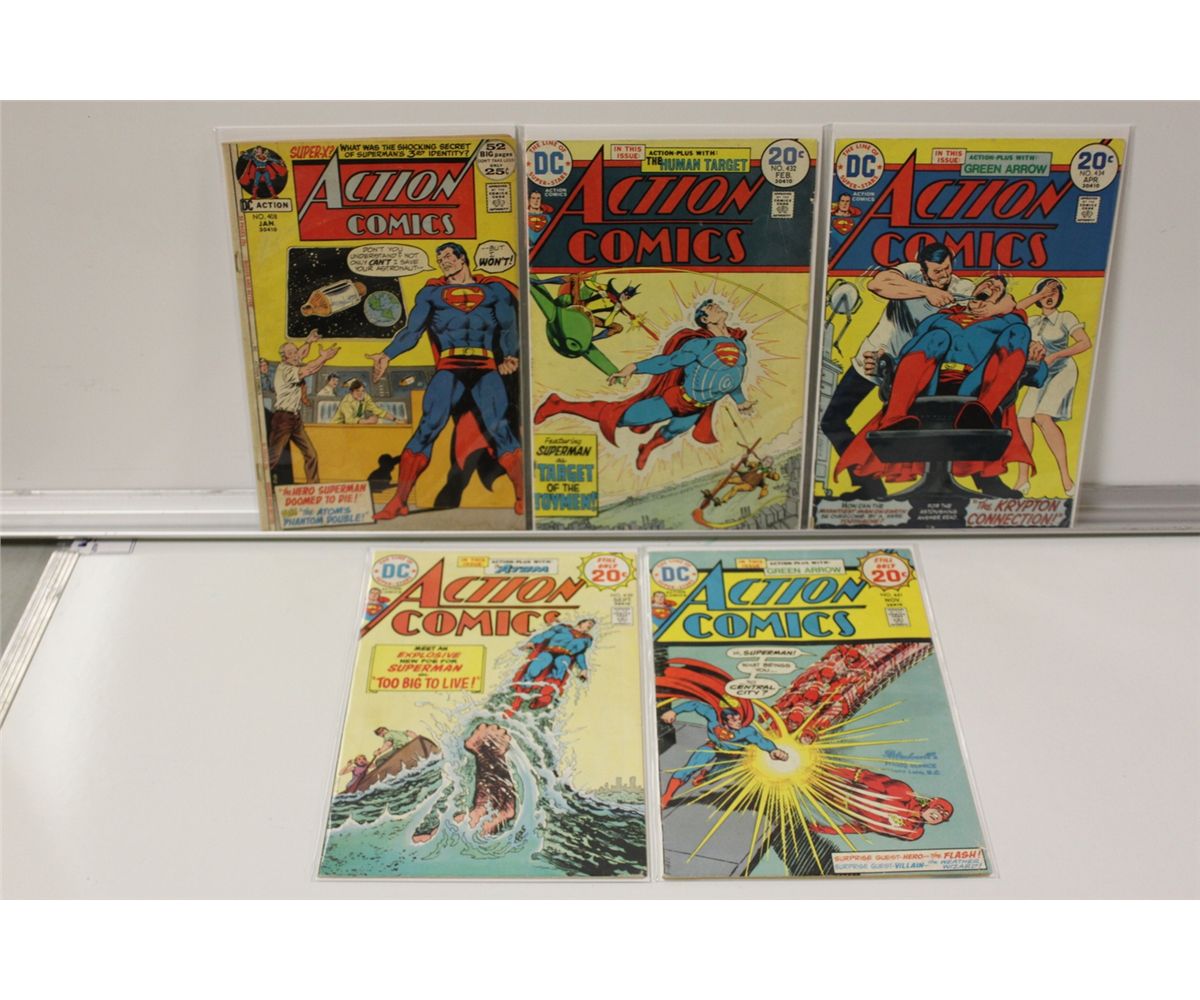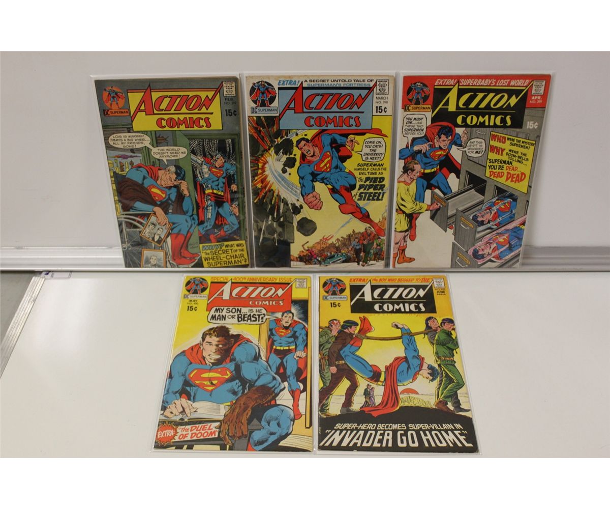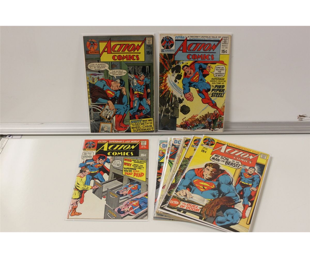ACTION COMICS EARLY BRONZE LOT. 10 ISSUES: #397-401, 408, 432, 434, 439 & 441, (1971-74) MID GRADE AVERAGE, NICE & SOLID LOT.