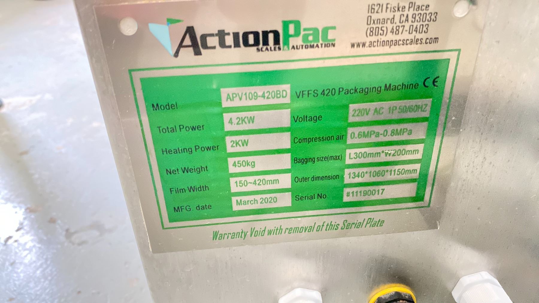 ACTIONPAC APV109 AUTOMATED BAGGING MACHINE. WEIGH SCALE MEASURING. MARKHEM SMARTDATE X40 PRINTER, 5" COLLAR. REQUIRES SERVICING.