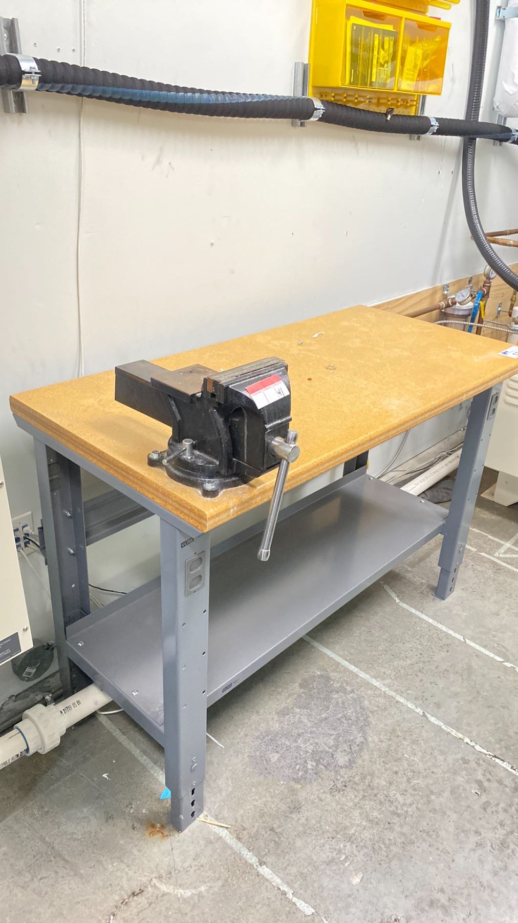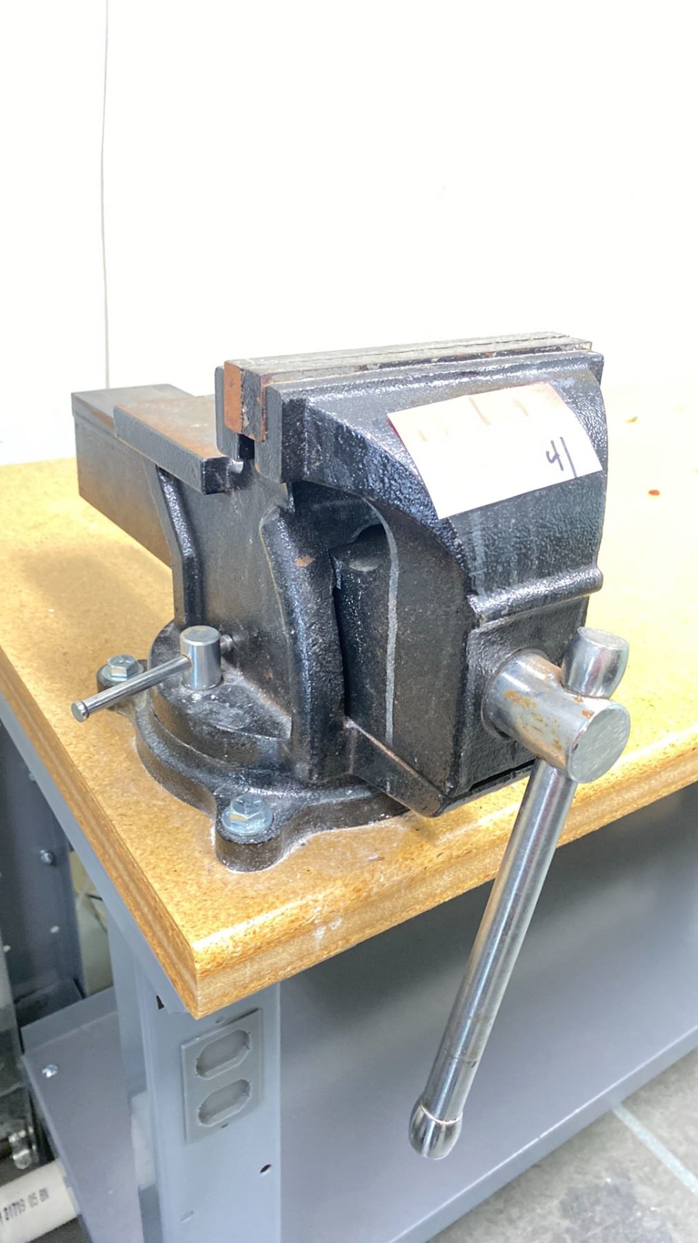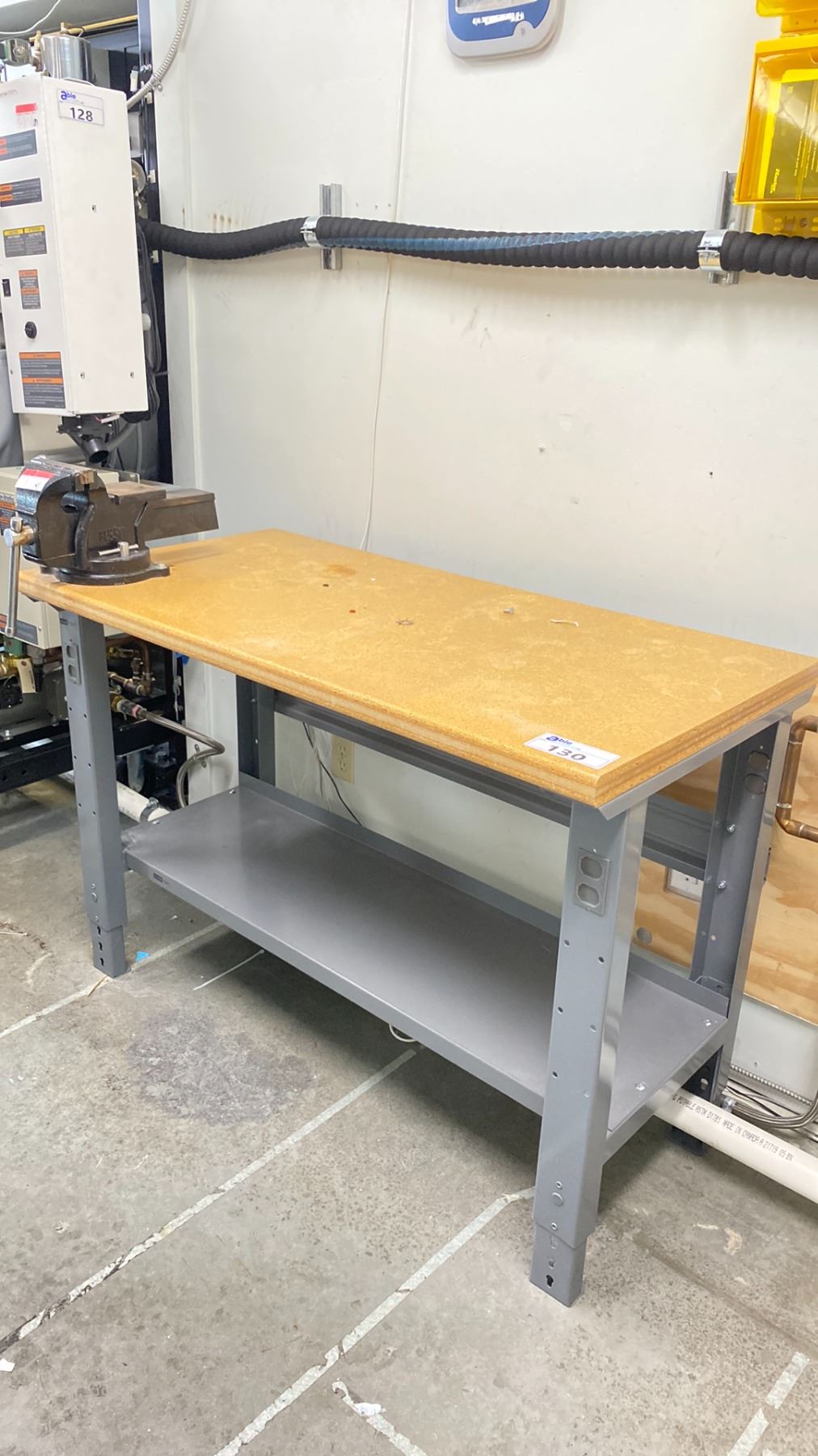 ADJUSTABLE HEIGHT WORKBENCH WITH MECHANICS VISE APPROX 48 X 24"