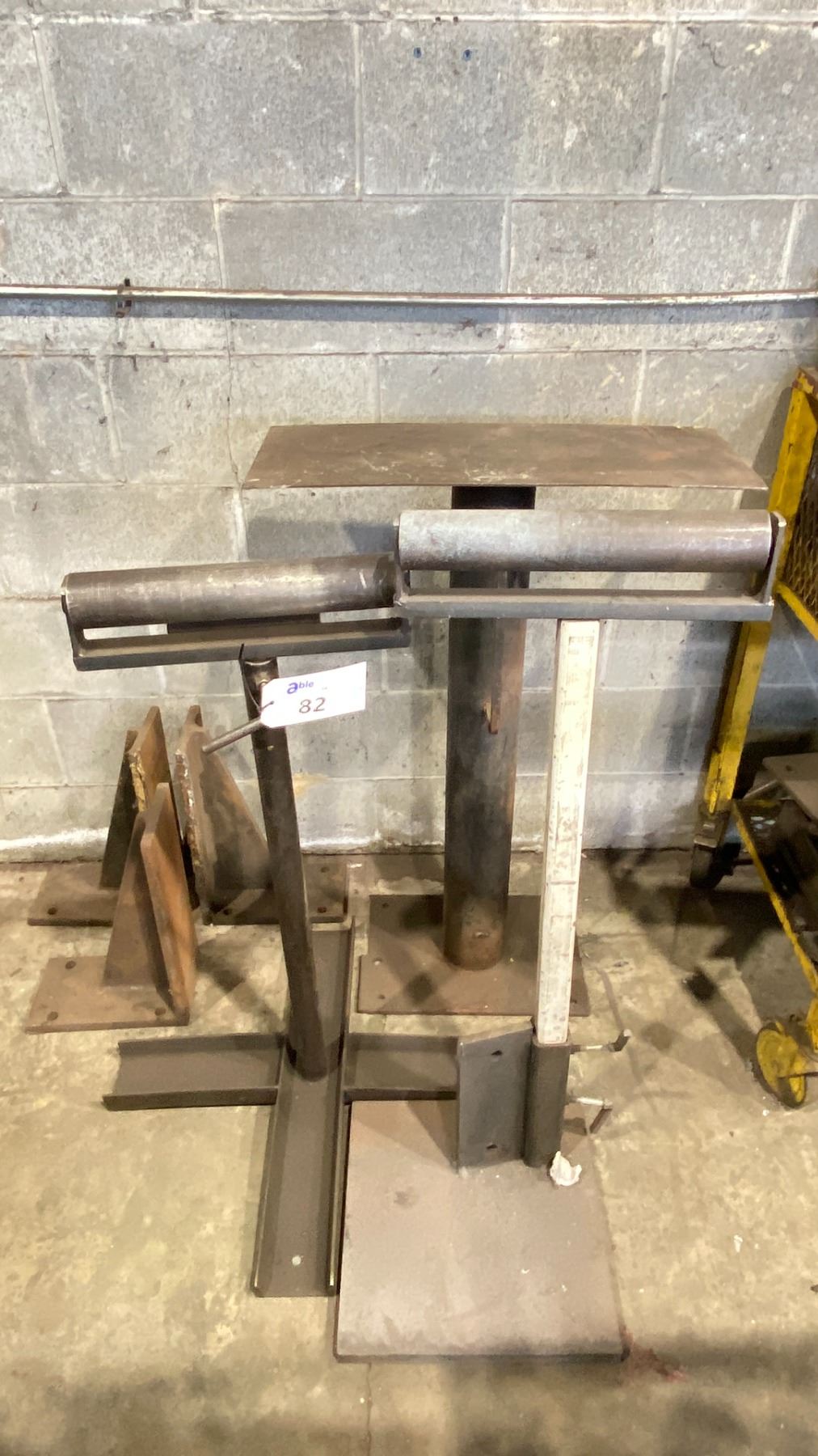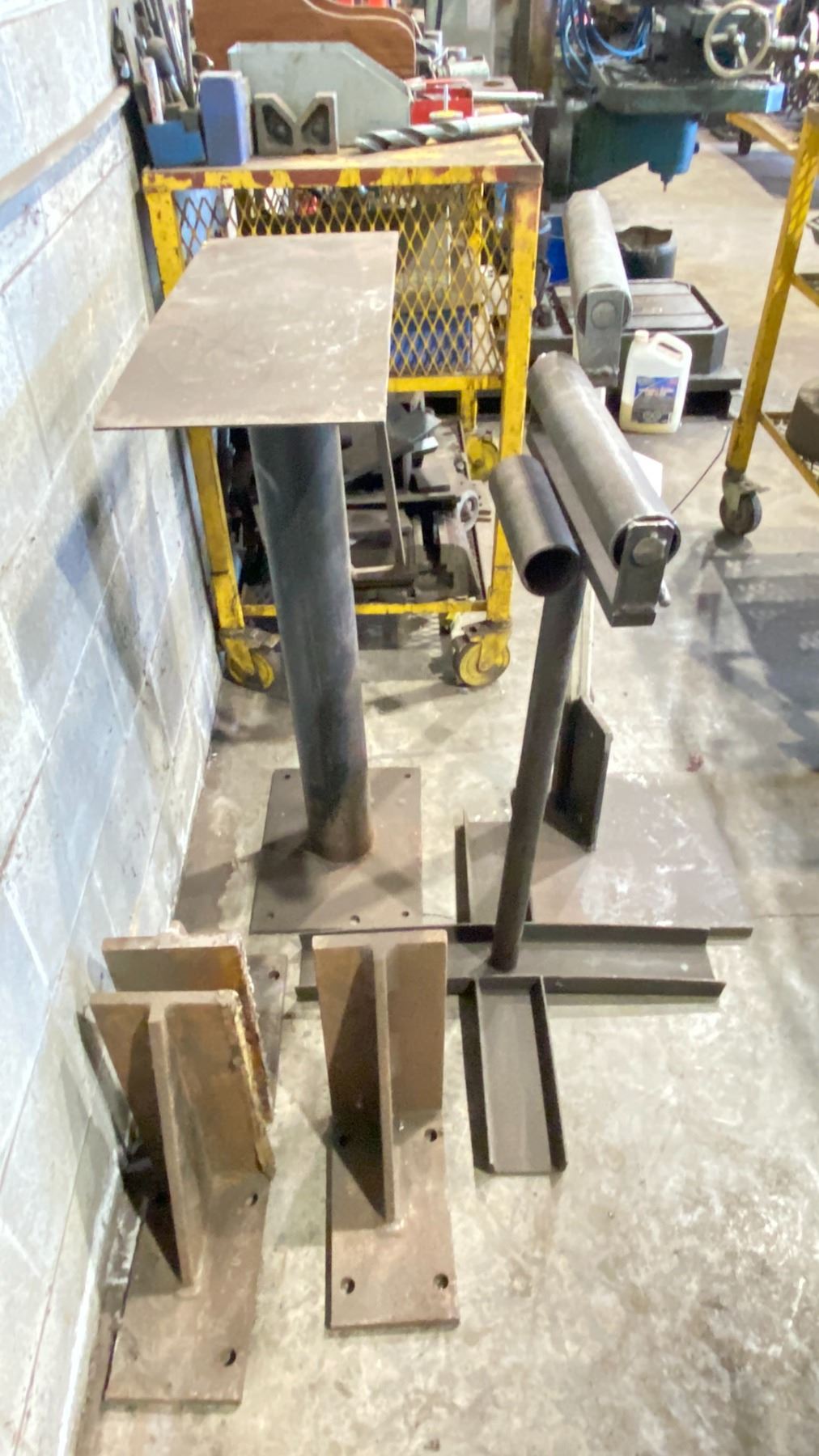 ADJUSTABLE PEDESTAL MATERIAL ROLLER STANDS, WORK STAND & (3) 90 DEGREE MILLING AND DRILLING ANGLE BRACKETS