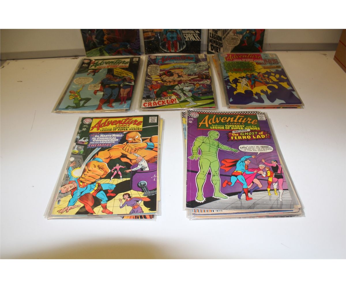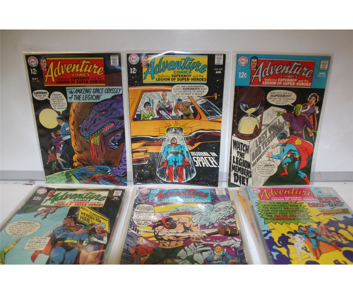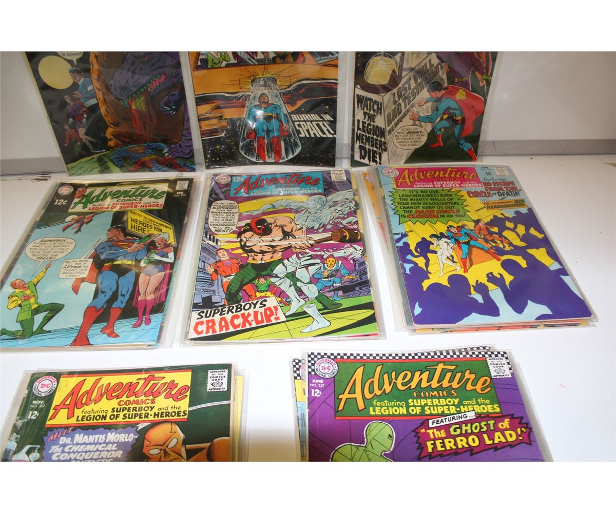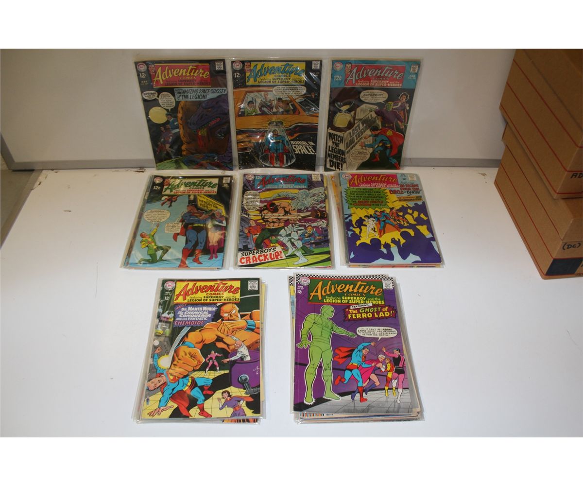 ADVENTURE COMICS #316,334,350-353 & 355-380 (1964-68) LARGE 32 ISSUE SILVER AGE RUN. MOST HAVE MULTIPLE STAPLE HOLES AT SPINE THROUGH BOOK WHERE EXTRA STAPLES WERE ADDED AND REMOVED. MID GRADE AVG, GLOSSY, TIGHT & SUPPLE.