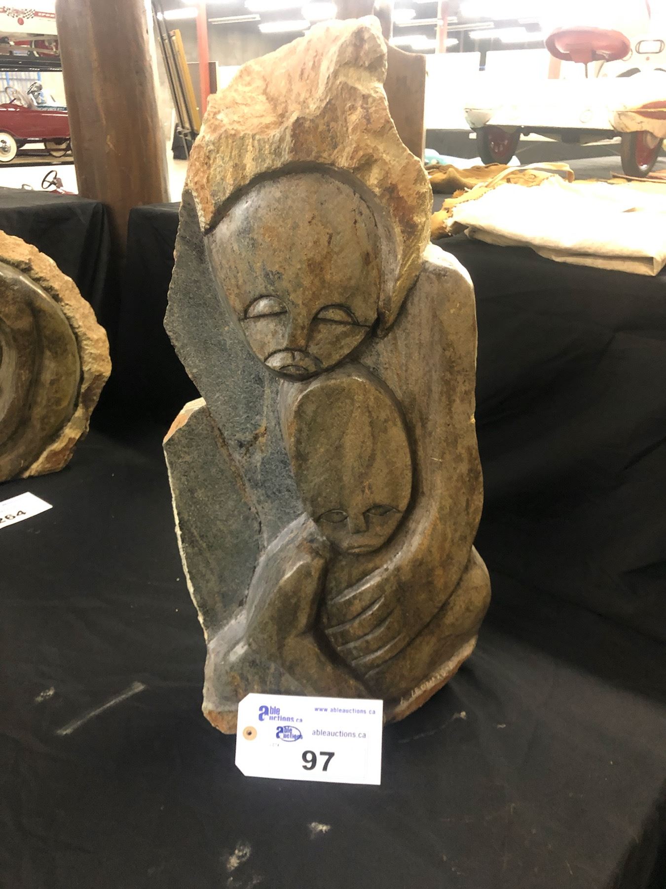 AFRICAN SHONA SOAP STONE STATUE, MOTHER HUGGING CHILD, SIGNED BY ARTIST, "LEONARD", 25.5" TALL