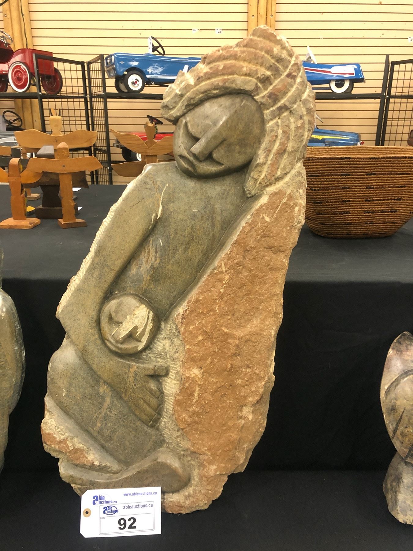 AFRICAN SHONA SOAP STONE STATUE, MOTHER WITH BABY, SIGNED BY ARTIST, "JOSEPH", 33" TALL