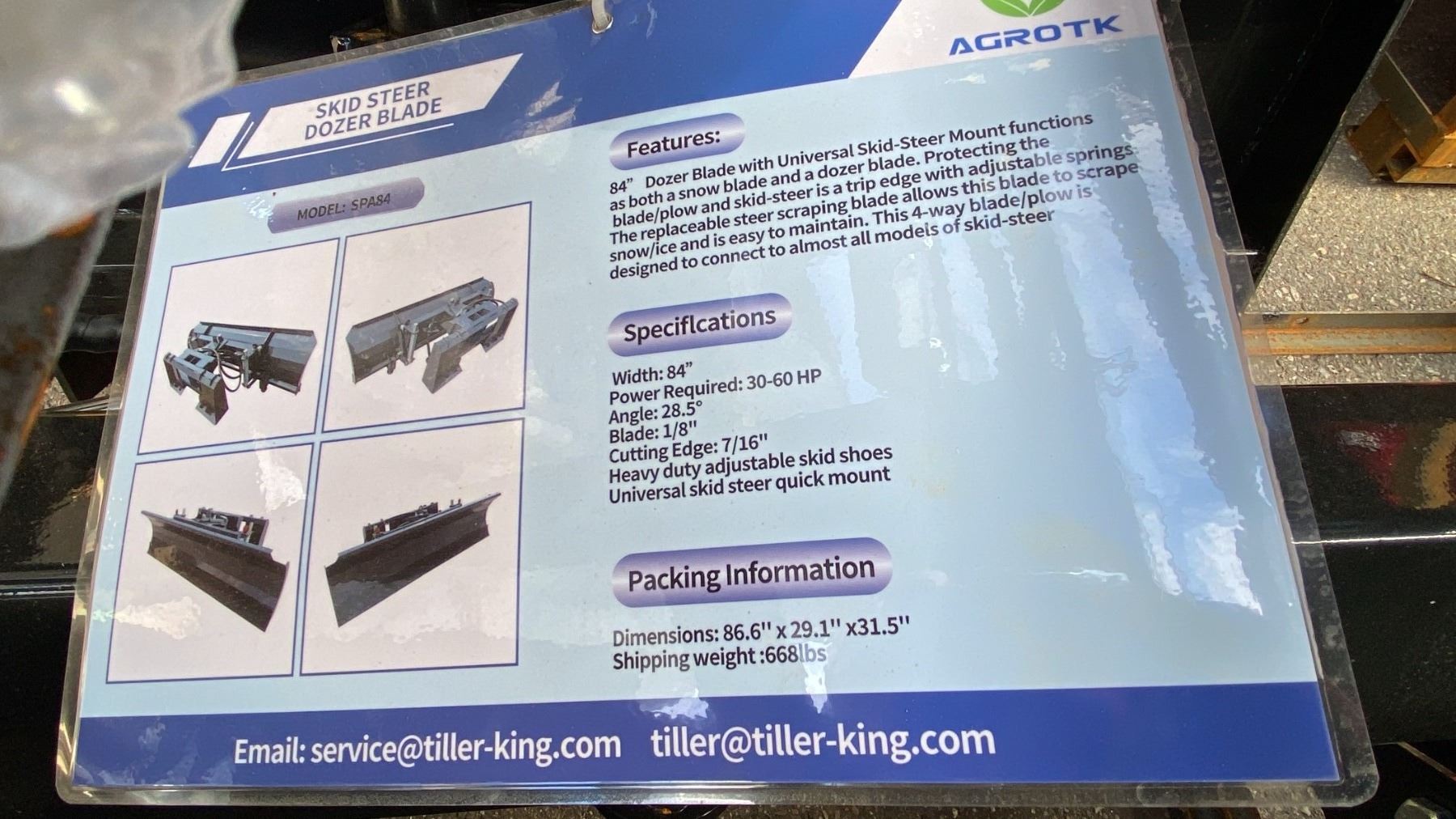 AGROTK SPA84, 84" HYDRAULIC SKID STEER DOZER BLADE/PLOW ATTACHMENT