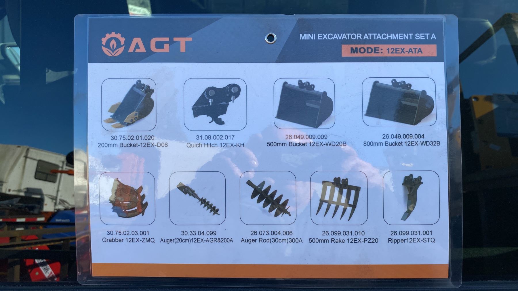 AGT INDUSTRIAL 9PCS MINI EXCAVATOR ATTACHMENT SET 12EX-ATA INCLUDES A QUICK COUPLER, RIPPER, RAKE, GRABBER (GRAPPLE), AUGER WITH RODS, AND THREE BUCKET SIZES 8", 20", 32"