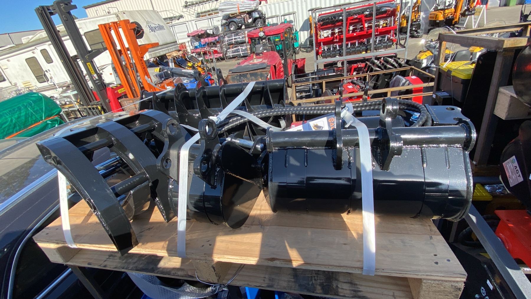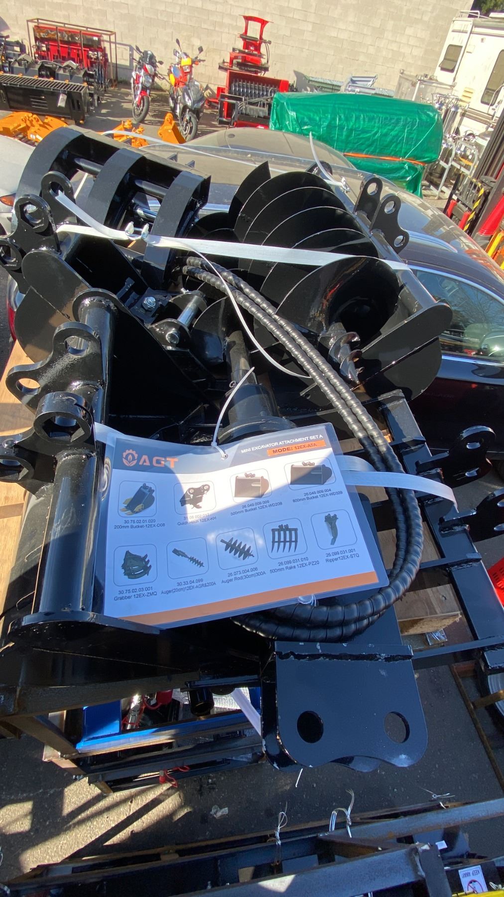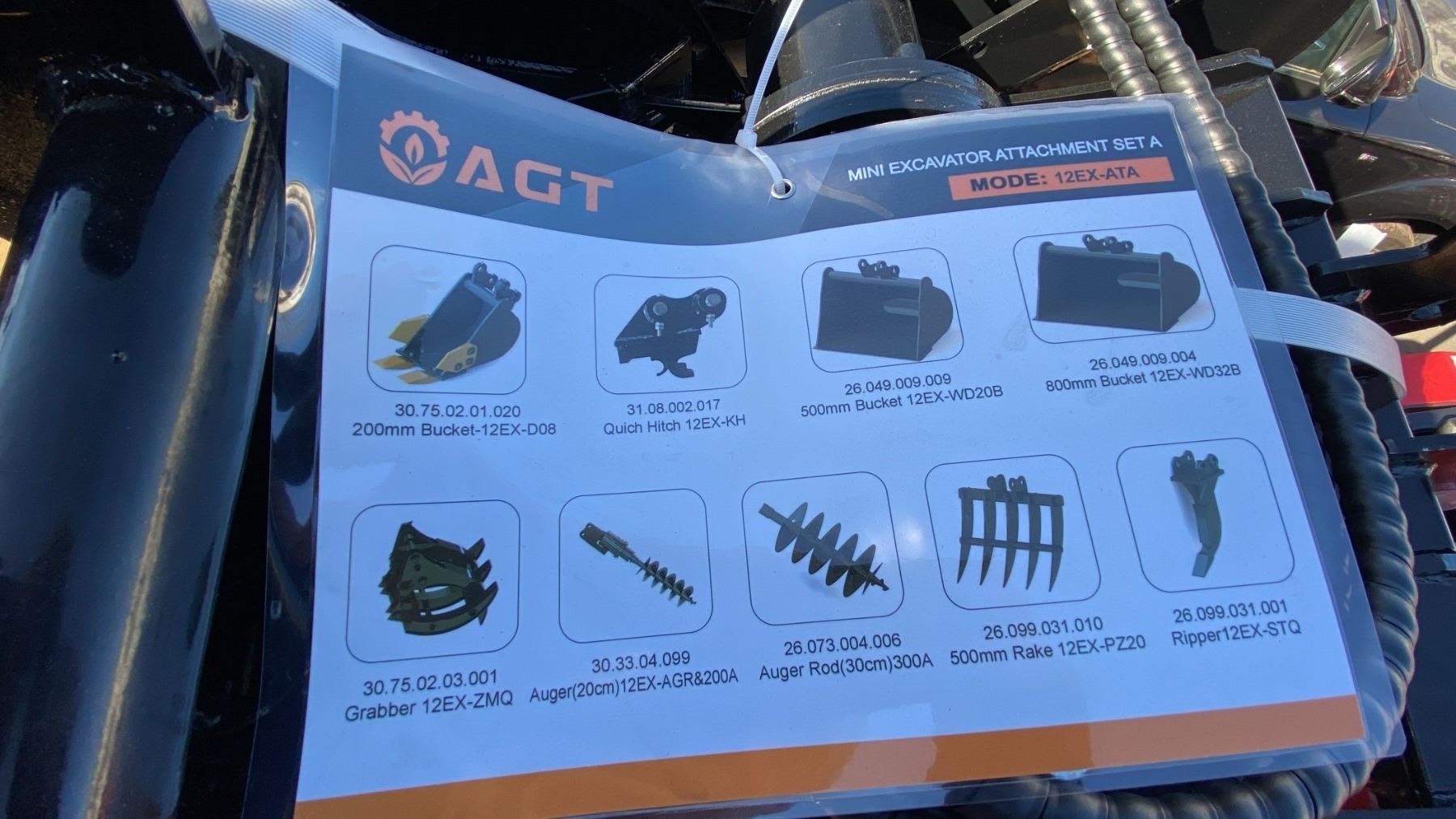 AGT INDUSTRIAL 9PCS MINI EXCAVATOR ATTACHMENT SET 12EX-ATA INCLUDES A QUICK COUPLER, RIPPER, RAKE, GRABBER (GRAPPLE), AUGER WITH RODS, AND THREE BUCKET SIZES 8", 20", 32"