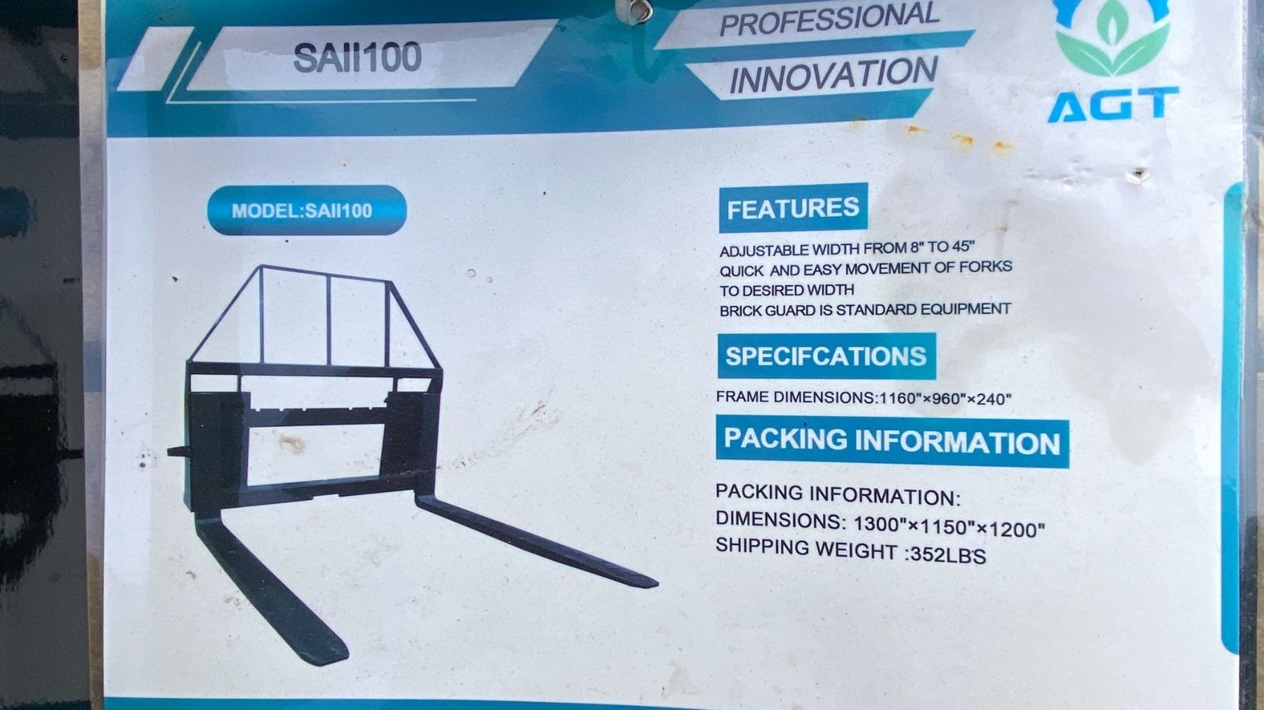 AGT INDUSTRIAL SAII100 SKID STEER PALLET FORK ATTACHMENT WITH 48" FORKS