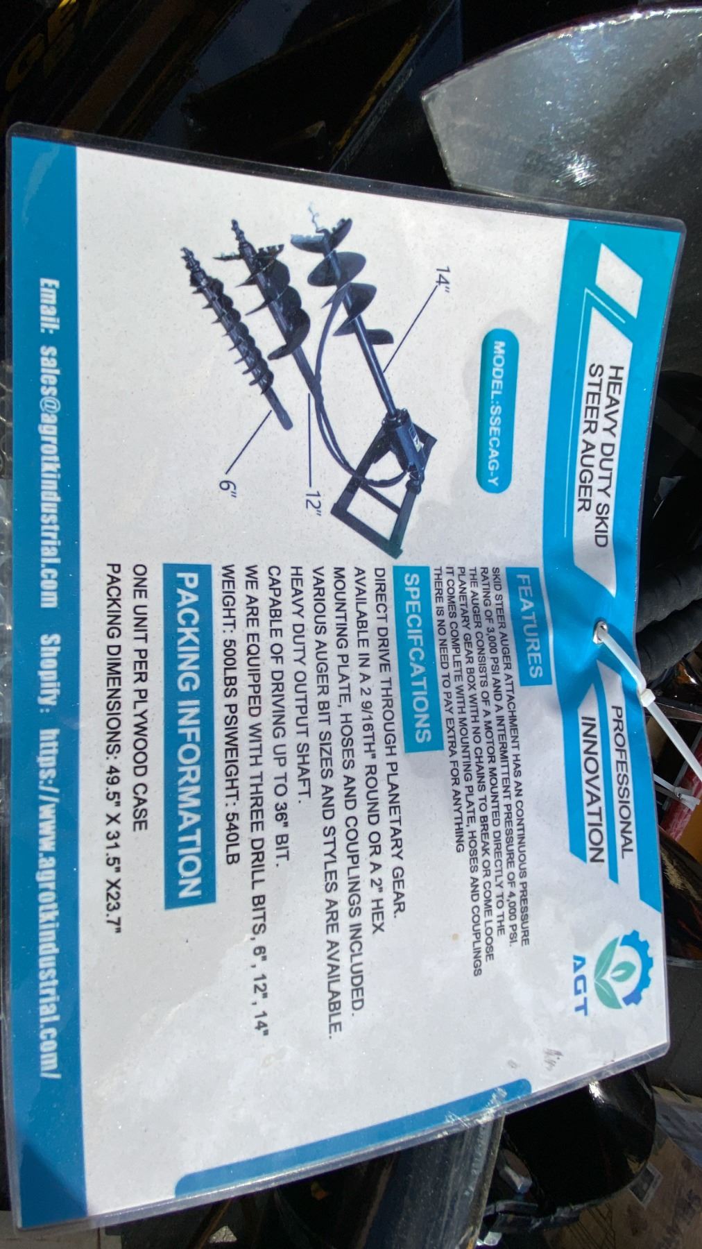 AGT SSECAG-Y HEAVY DUTY HYDRAULIC SKID STEER AUGER ATTACHMENT SET 6", 12" & 14" DIAMETER BITS