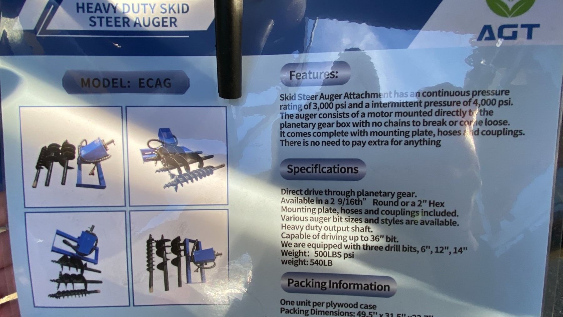 AGT SSECAG-Y HEAVY DUTY HYDRAULIC SKID STEER AUGER ATTACHMENT SET 6 , 12  & 14  DIAMETER BITS