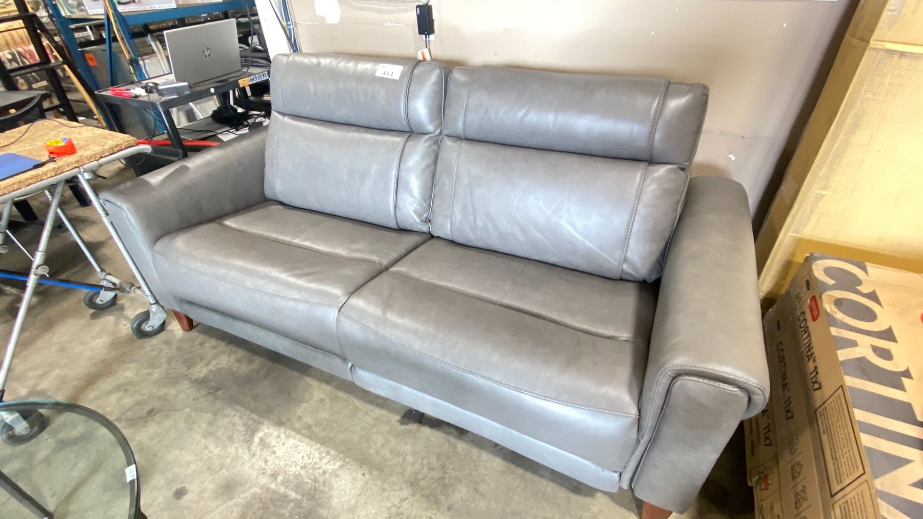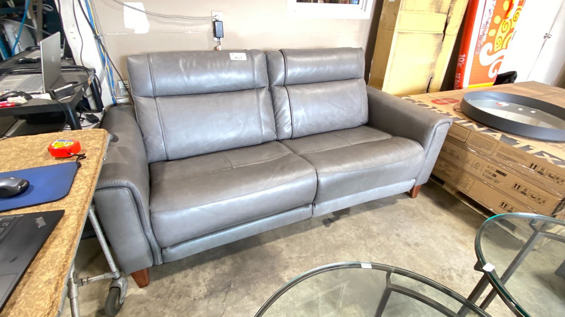 AIDEN & IVY GREY LEATHER POWERED 2 SEAT RECLINING SOFA WITH POWERED HEAD RESTS *HAS POWER ADAPTER*