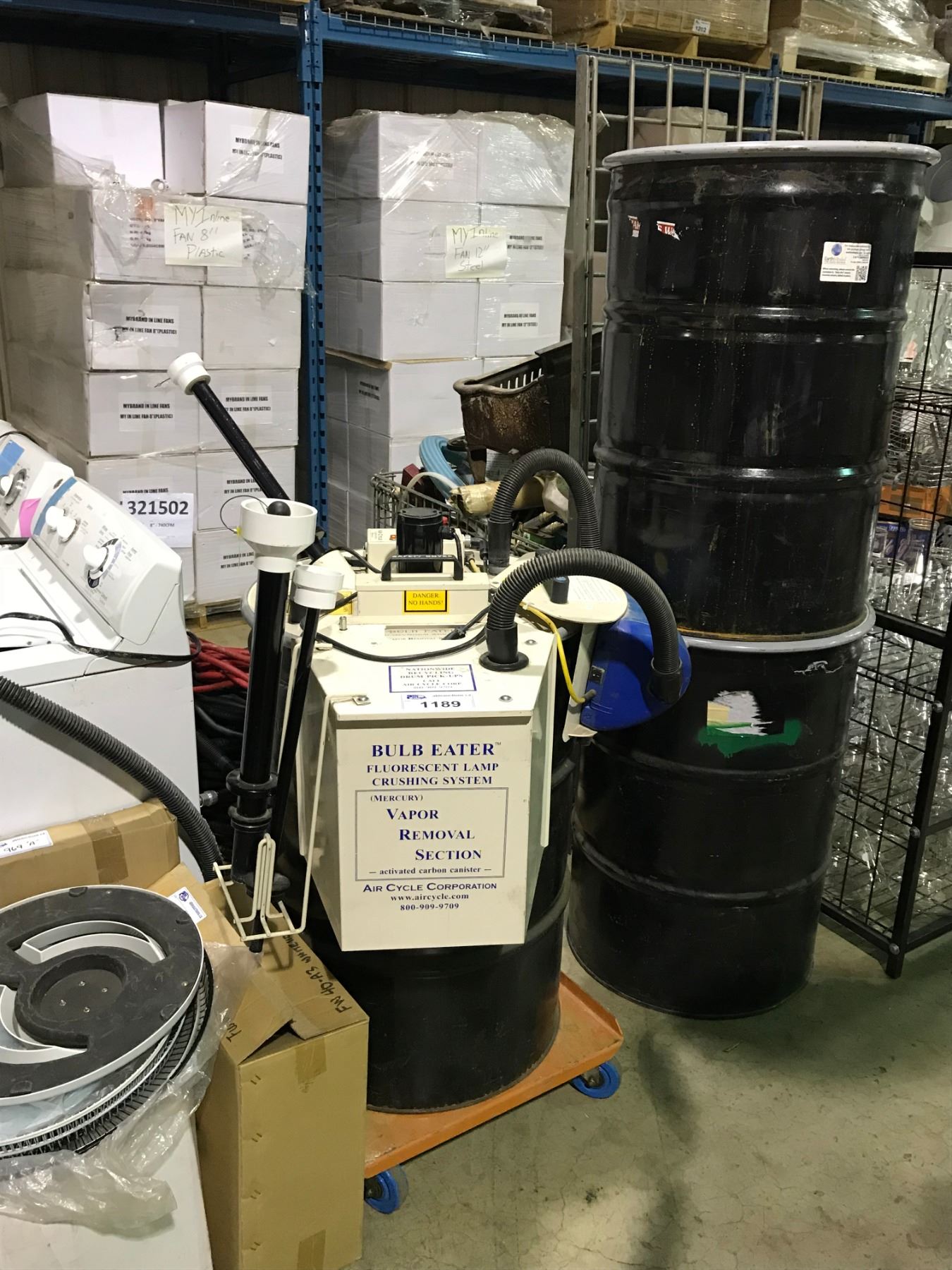 AIR CYCLE BULB EATER FLUORESCENT LAMP CRUSHING SYSTEM WITH 2 EXTRA STORAGE BARRELS & CART