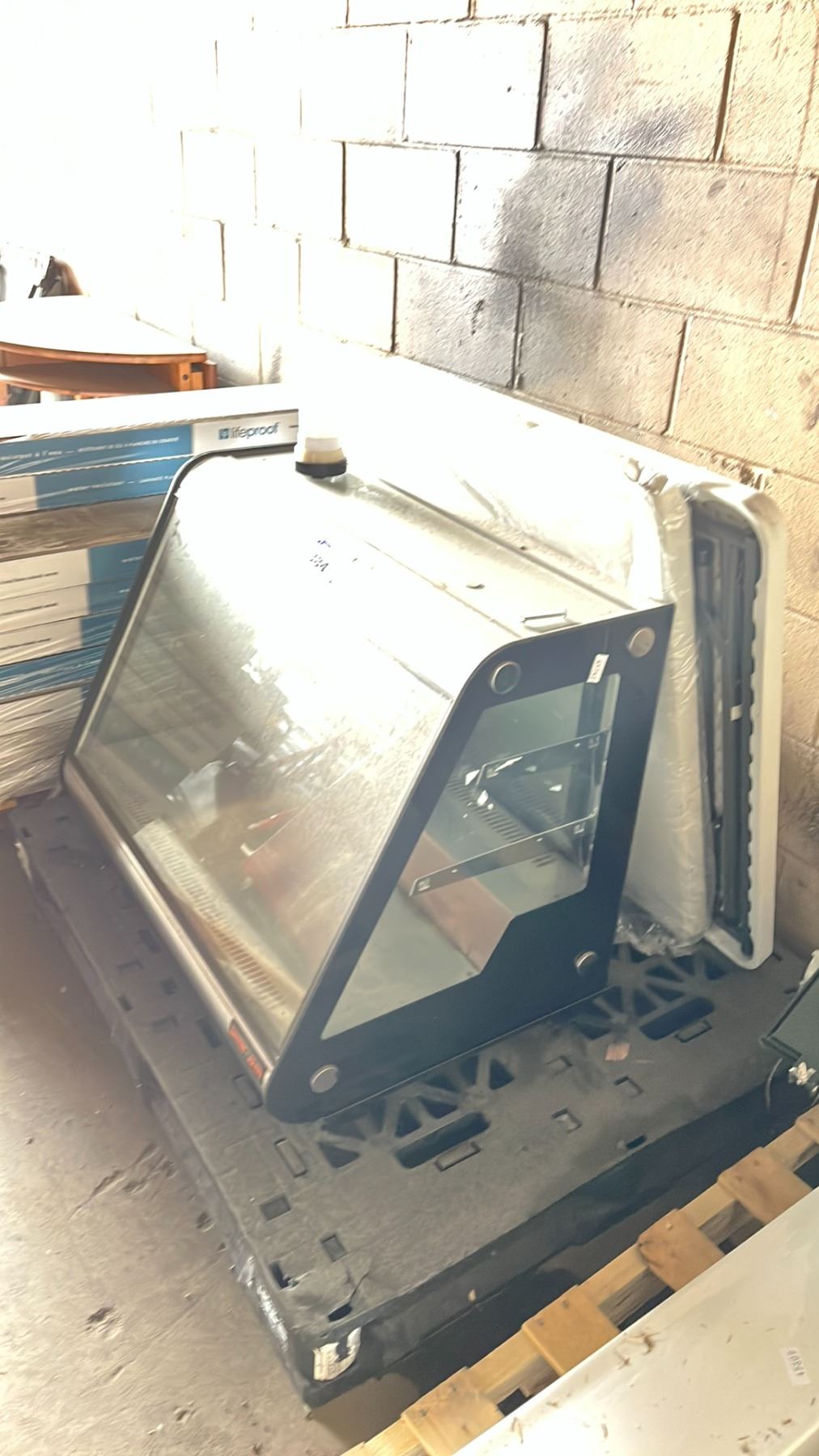 AIR GLASS DISPLAY CABINET (NO SHELVES) AND 2 DAMAGED FOLDING TABLES