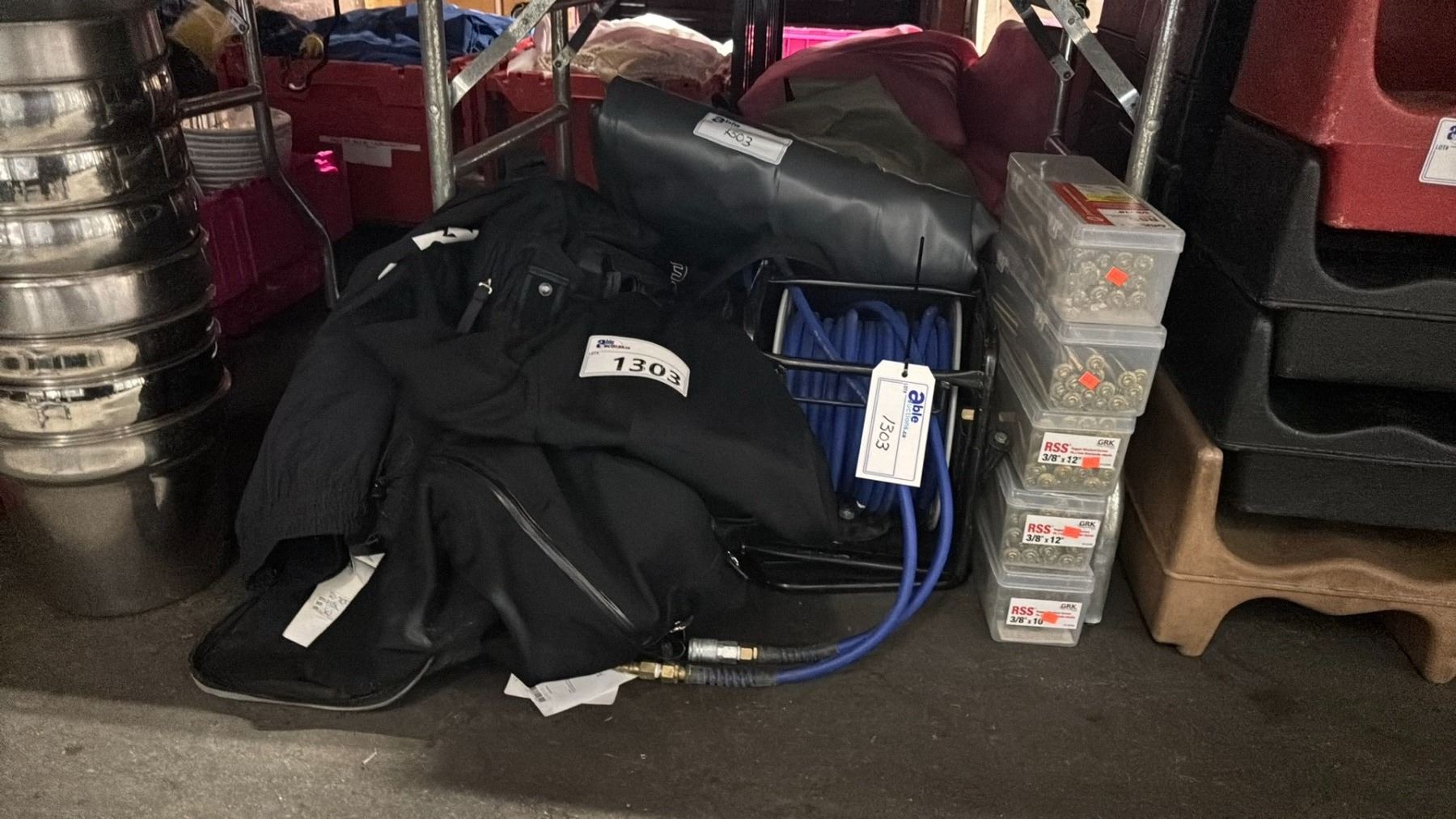 AIR HOSE REEL, DECK SCREWS, BAG OF PADDED SHORTS & AN INFLATABLE BOAT