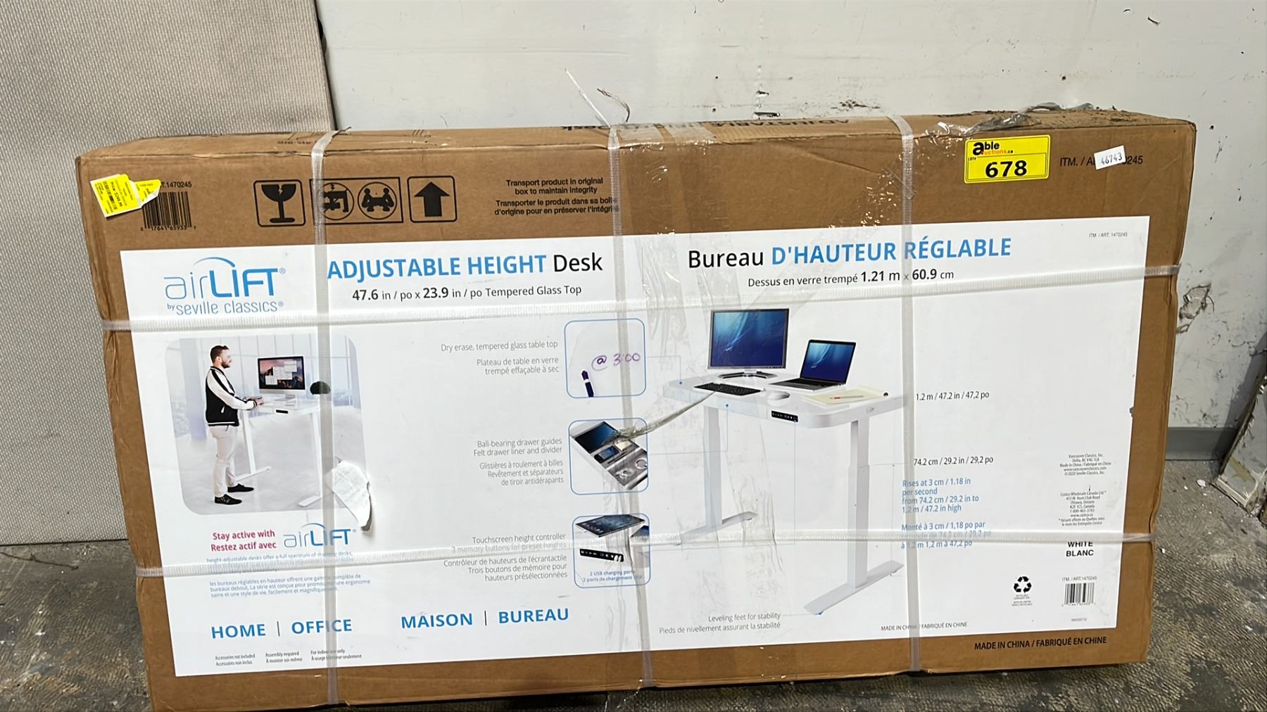 AIRLIFT BY SEVILLE CLASSICS ADJUSTABLE HEIGHT DESK WITH DRY ERASE TEMPERED GLASS TABLE TOP & TOUCHSCREEN HEIGHT CONTROLLER - 47.2"W X 23.9"D X 29.2" - 47.2"H * IN BOX *