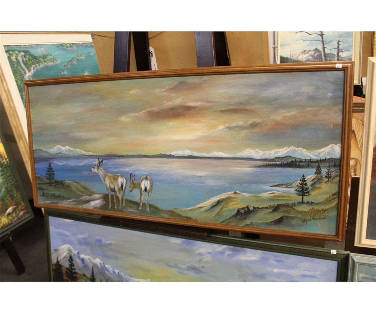 ALFRED EDSTROM "DEER BY LAKE" OIL ON WOOD, 47" W X 19" H SIGNED LOWER RIGHT ALL NET PROCEEDS FROM THE SALE OF THIS ARTWORK WILL BE DONATED TO THE SQUAMISH FOOD BANK