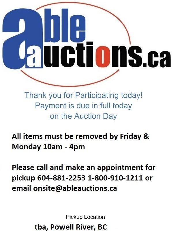 Payment is due in full today. If you authorize us via email or calling 604-881-2253 we can directly charge your Visa or MC on file.For e-transfers please email them to payment@ableauctions.ca Due to social distancing, we will not be taking in person payments. To reduce the amount of people in the building at one time we ask you call to book a time slot for pick up.