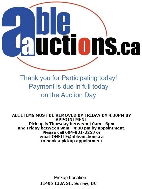 Please call 604-881-2253 or email ONSITE@ableauctions.ca to book a pickup appointment