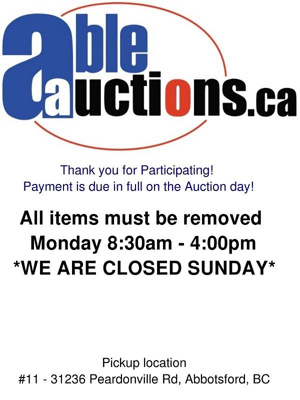 Able Solutions. Inc DBA Ableauctions.ca assumes no responsibility for any liability once a bid is accepted. It is recommended that purchasers arrange insurance for their purchases in advance.