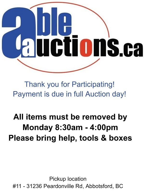 Able Solutions. Inc DBA Ableauctions.ca assumes no responsibility for any liability once a bid is accepted. It is recommended that purchasers arrange insurance for their purchases in advance.