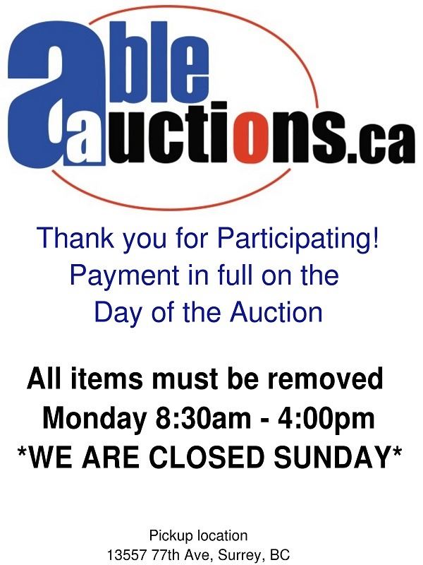 Payment is due in full today. We’ve attached a link to PayPal for payment or if you authorize us via email or calling 604-594-2253 we can directly charge your Visa or MC on file. Or if you prefer you can pay in person until 4:30pm with Visa, MC, Interac or Cash. For e-transfers please email them to payment@ableauctions.ca with a security answer of Ableauctions