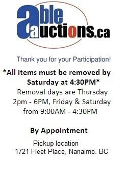 Able Solutions. Inc DBA Ableauctions.ca assumes no responsibility for any liability once a bid is accepted.  It is recommended that purchasers arrange insurance for their purchases in advance.