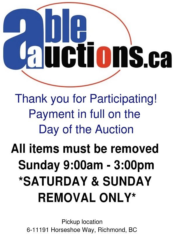 Payment is due in FULL today. We’ve attached a link to PayPal for payment or you we can directly charge your Visa or MC on file. Or if you prefer you can pay in person until 4:00pm with Visa, MC, or Interact. No cash will be accepted for this auction. For e-transfers please email them to payment@ableauctions.ca with a security answer of Ableauctions