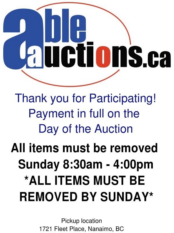 Payment is due in full today. We’ve attached a link to PayPal for payment or if you authorize us via email or calling 250-751-1250 we can directly charge your Visa or MC on file. Or if you prefer you can pay in person until 4:30pm with Visa, MC, Interac or Cash. For e-transfers please email them to payment@ableauctions.ca with a security answer of Ableauctions
