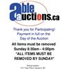 It is the sole responsibility of the purchaser to remove their items within the prescribed time. Able Solutions Inc. will NOT provide any delivery or transport of any nature for live auction items.