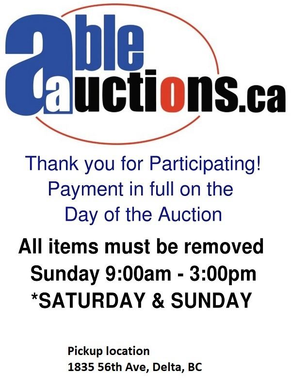 Payment is due in full today. We’ve attached a link to PayPal for payment or if you authorize us via email or calling 604-881-2253 we can directly charge your Visa or MC on file. Or if you prefer you can pay in person until 4:30pm with Visa, MC, or Interac(no Cash will be accepted at onsite auctions). For e-transfers please email them to payment@ableauctions.ca with a security answer of Ableauctions