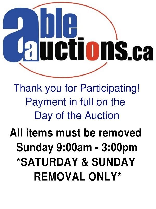 Able Solutions. Inc DBA Ableauctions.ca assumes no responsibility for any liability once a bid is accepted. It is recommended that purchasers arrange insurance for their purchases in advance.