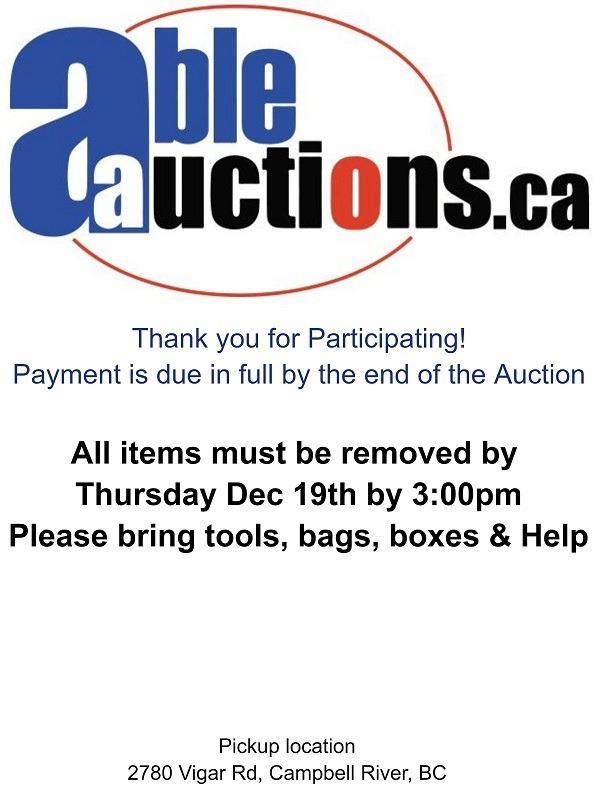 Pick up must be completed this THURSDAY December 19TH, 2019 between 9am and 4pm. Pick up address is 2780 Vigar Rd. Campbell River, BC. Contact us at 604-881-2253 with any questions.