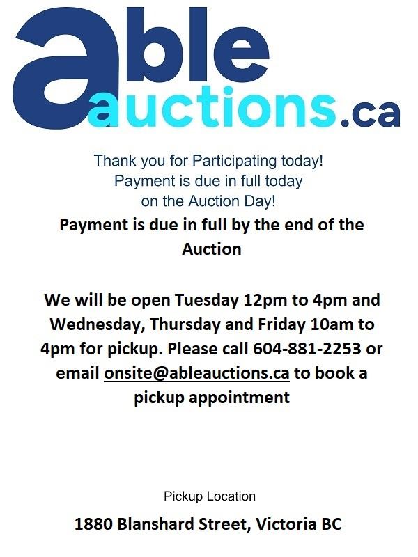 Payment is due in full today. if you authorize us by calling 604-881-2253 we can directly charge your Visa or MC on file (only applies to purchases under $999). *Please note we will need to have a verbal confirmation of the last 4 digits of your credit card to process the payment* For e-transfers please email them to payment@ableauctions.ca Payment is Online only. Pickup is by appointment please call to book a time slot.