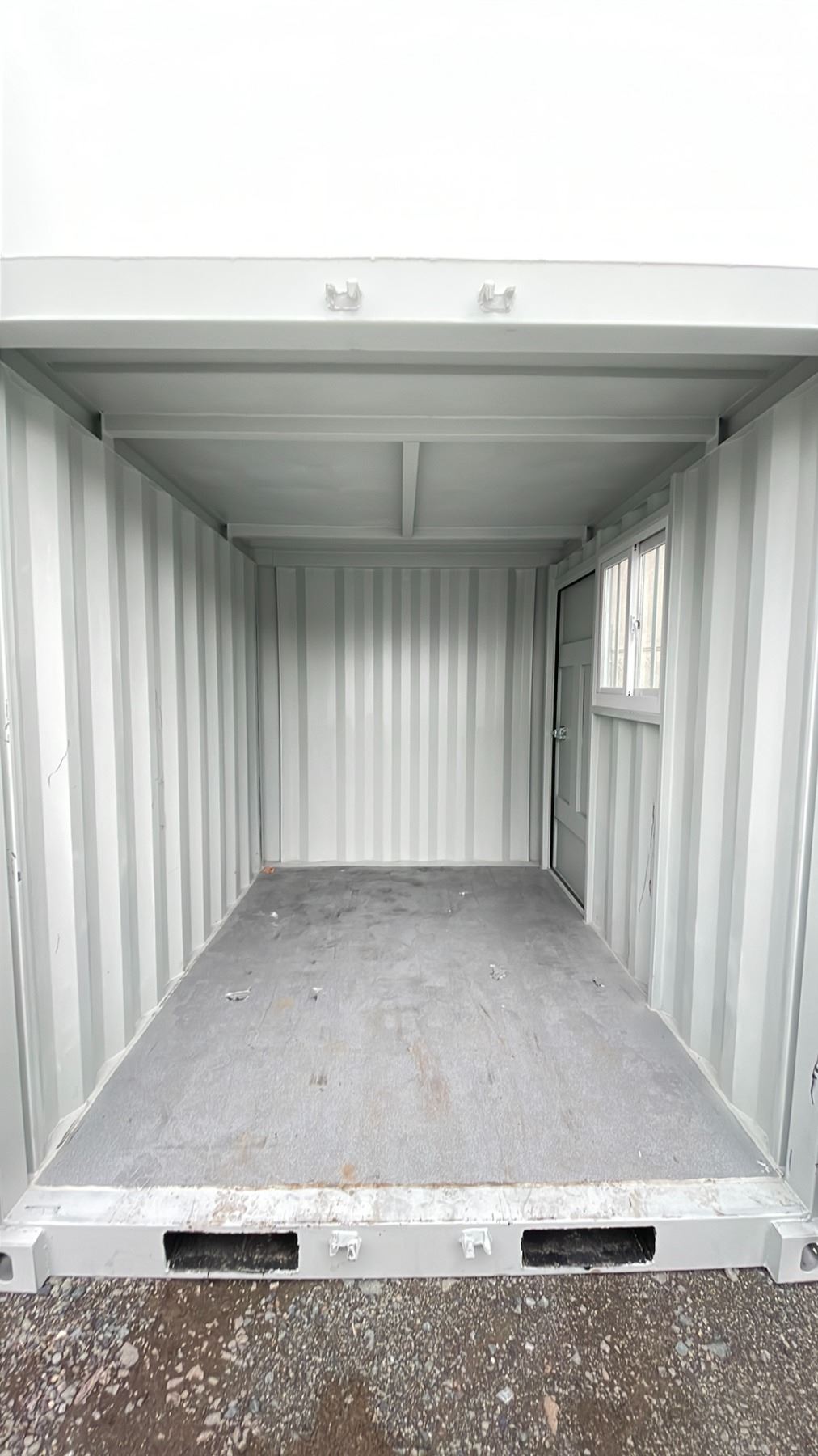 ALLMETAL KJ10A-28 GREY 8' OFFICE STORAGE SHIPPING CONTAINER WITH DUAL SWING REAR DOORS, CAM LOCKS, SIDE MAN DOOR, WINDOW & INSULATED FLOOR 116"L X 86"W X 98"H (UNKNOWN WEIGHT CAPACITY) (LAST DAY REMO
