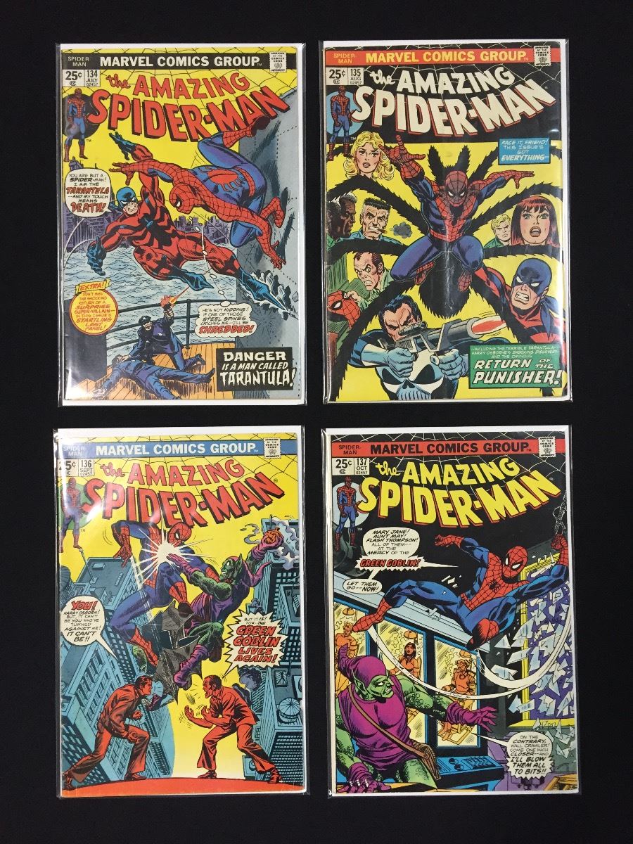 AMAZING SPIDER-MAN #134-137 (1974) 4 KEY ISSUES #134 - 1ST APP. TARANTULA, #135 -2ND APP. PUNISHER#136-137 - 1ST NEW GREEN GOBLIN, MID GRADE AVG * #135 & 137 MISSING STAMPS