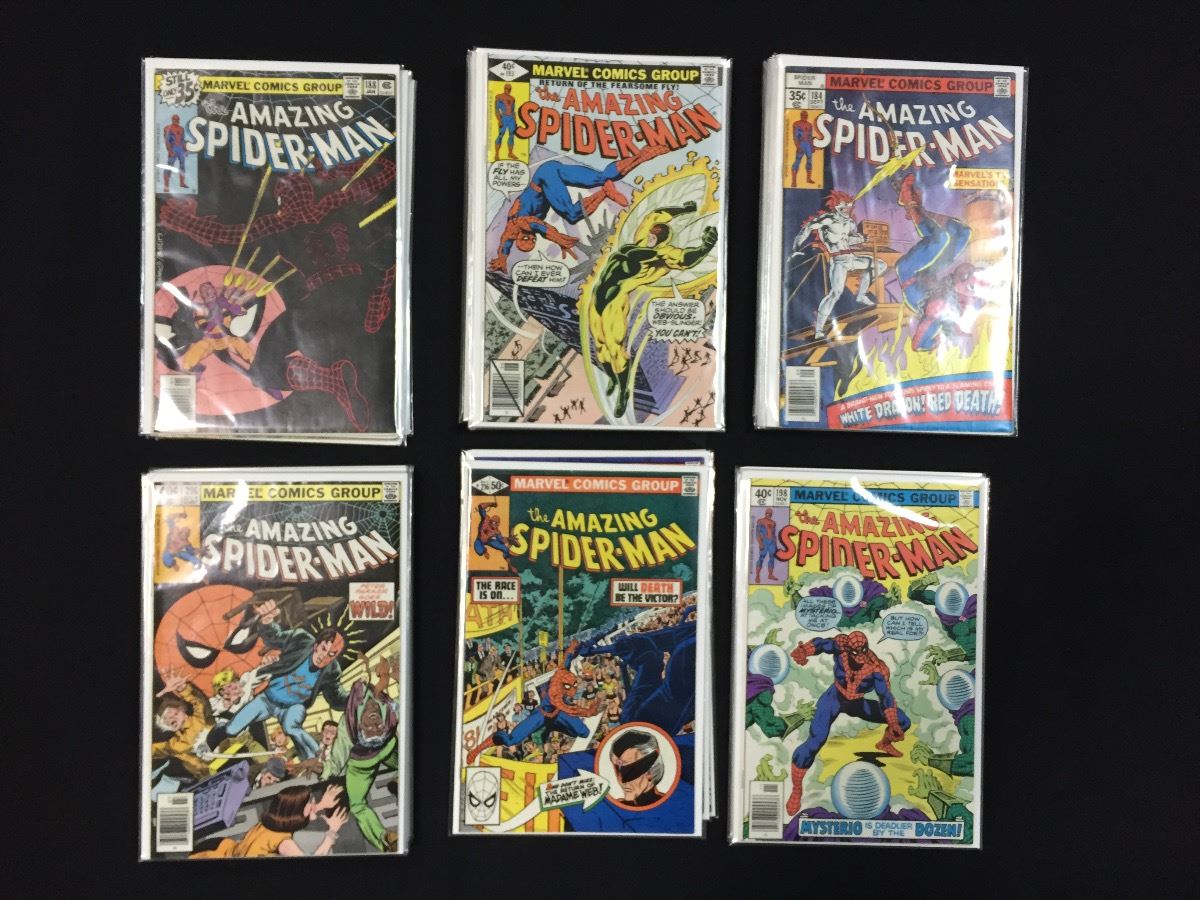AMAZING SPIDER-MAN  #159 (X2) 168,170,181-193,195-199,201-213 & 216. (1976-81) BRONZE AGE SPIDEY RUN. MID TO HIGH GRADE AVG, COPIES IN 200'S ARE HIGHER GRADE. 36 BOOKS TOTAL.