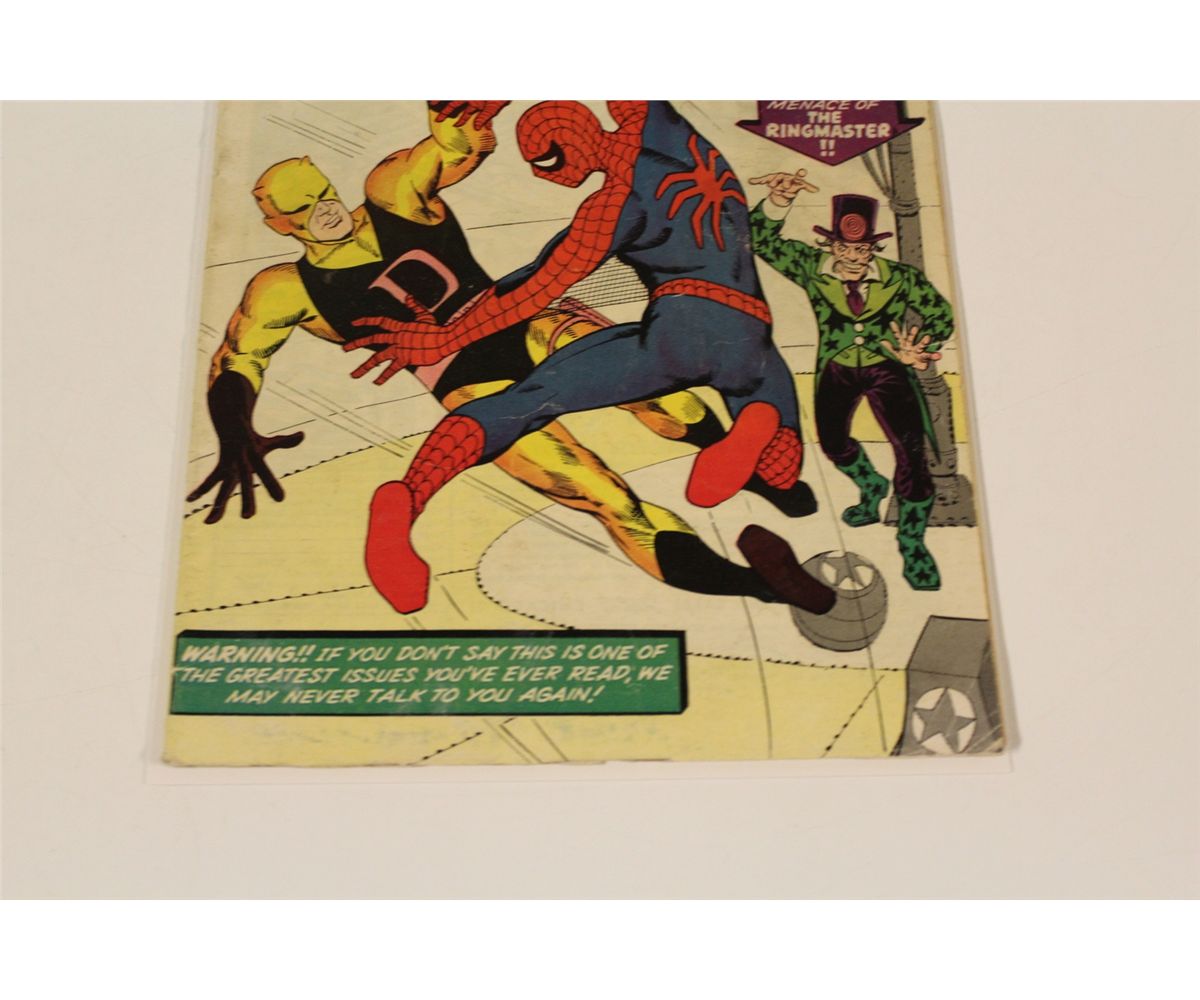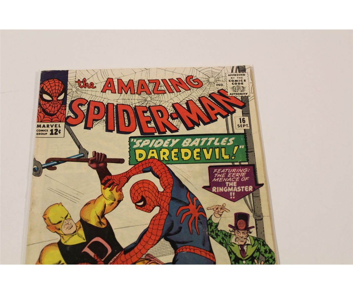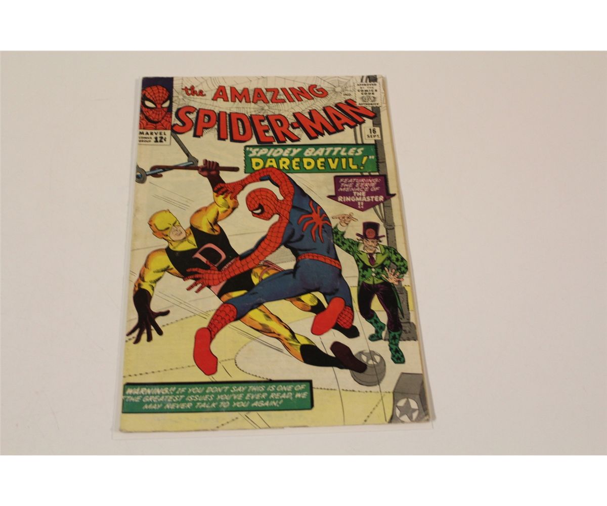 AMAZING SPIDER-MAN #16 (1964) 1ST DAREDEVIL X-OVER. SOLID MID GRADE, GLOSSY, FLAT, TIGHT, WHITE PAGES. VERY NICE COPY!