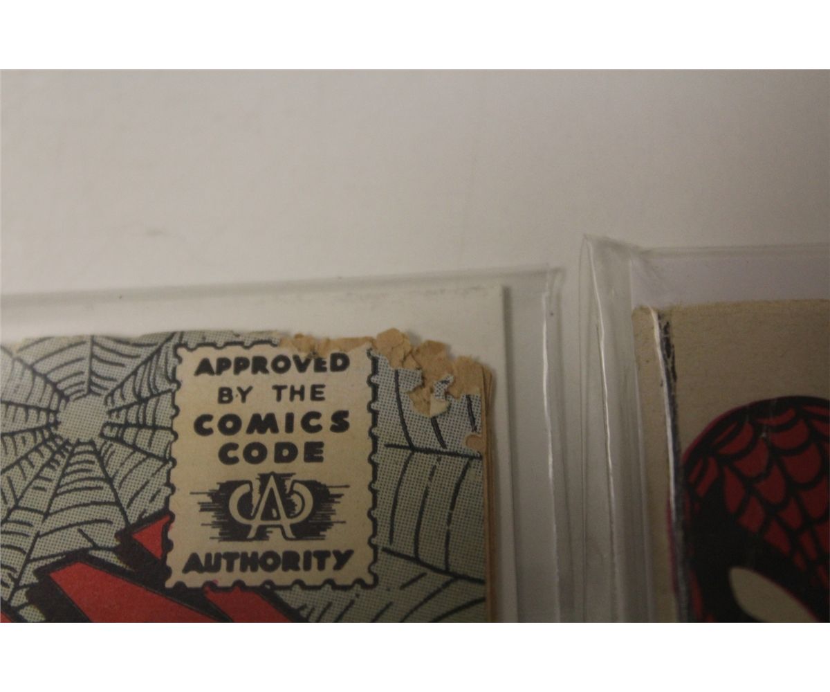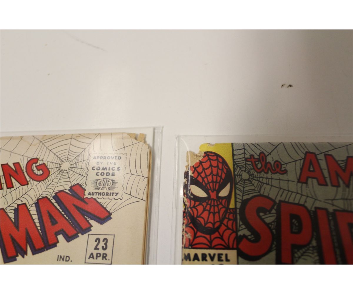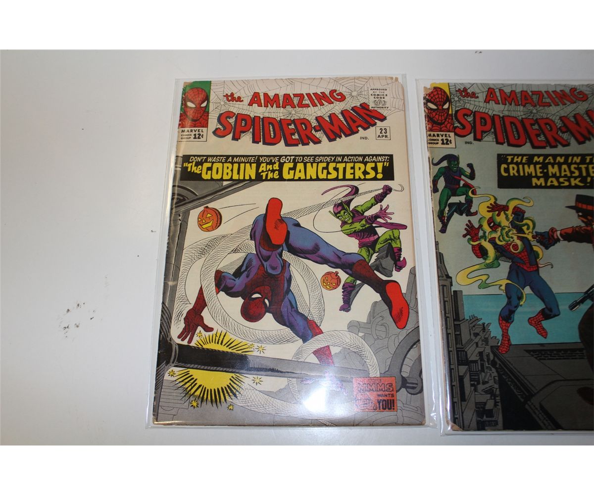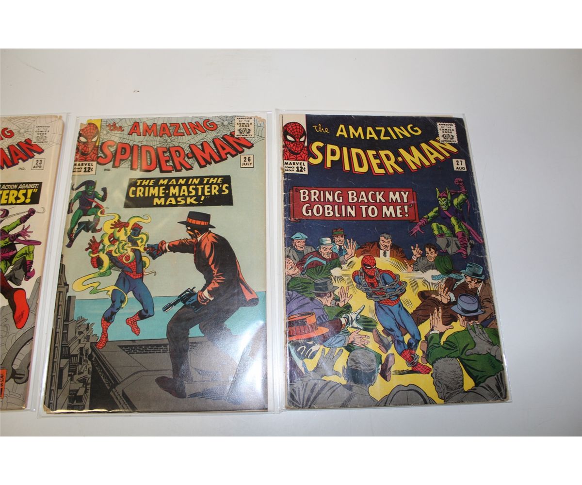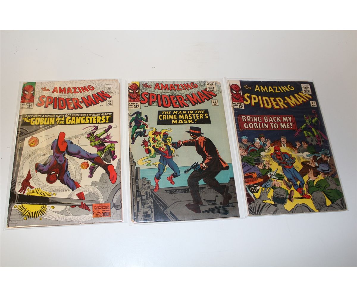AMAZING SPIDER-MAN #23, 26 & 27 (1965) 3RD, 4TH AND 5TH APP. GREEN GOBLIN. #23 & 26 HAVE BOOK LENGTH RAT CHEWS AT TOP CORNERS O/W HIGH MID GRADE COPIES. #27 IS LOW TO LOWER MID GRADE, CF ATTACHED