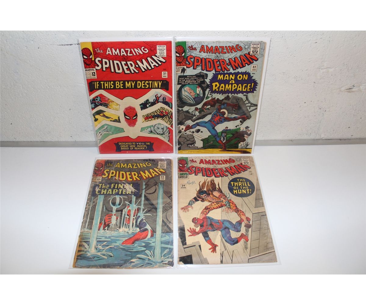 AMAZING SPIDER-MAN # 31, 32, 33, & 34 (1965-1966) # 31 -1ST GWEN STACY. LOWER GRADE AVERAGE. SOLID COMPLETE COPIES. 4 BOOKS TOTAL.