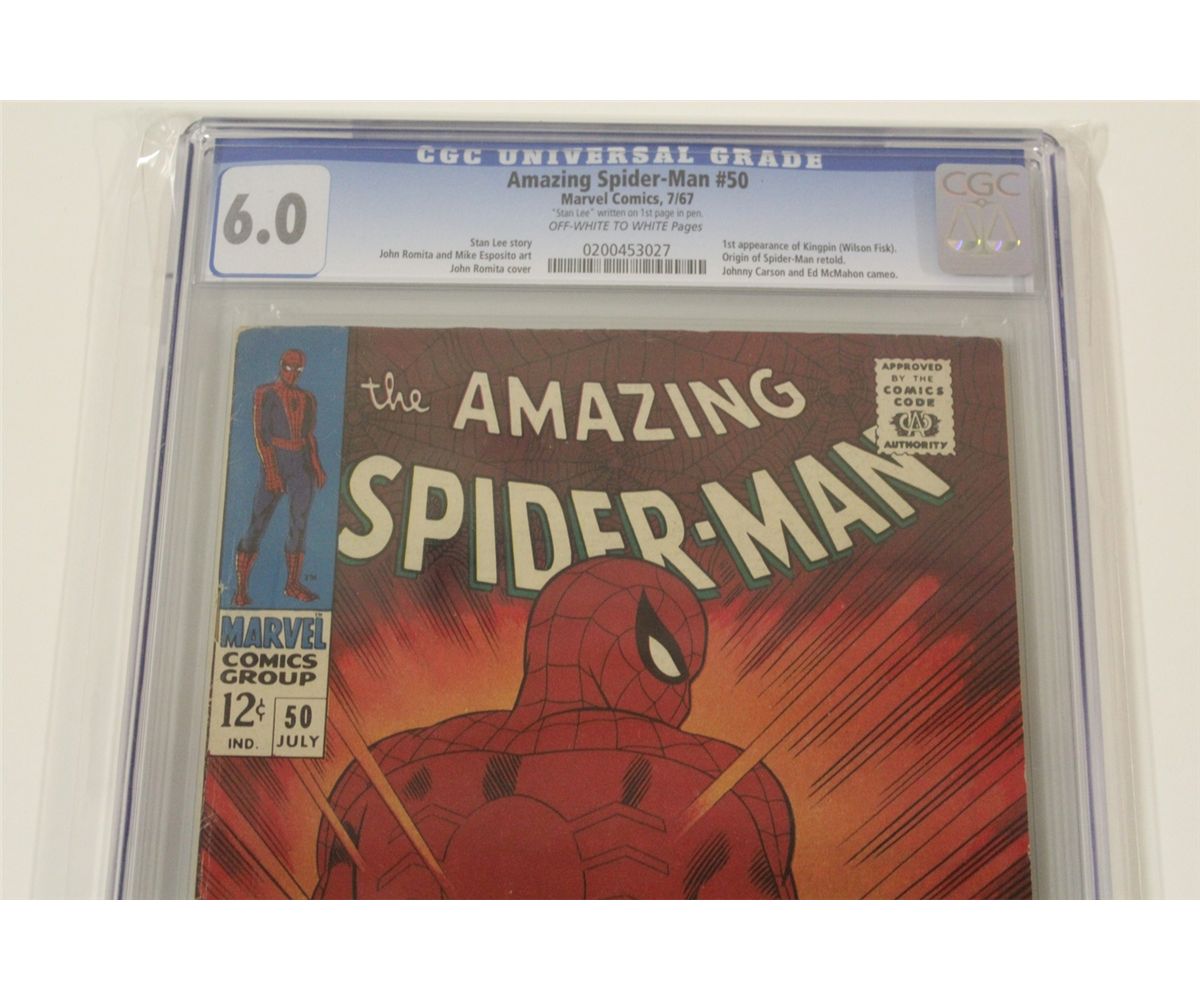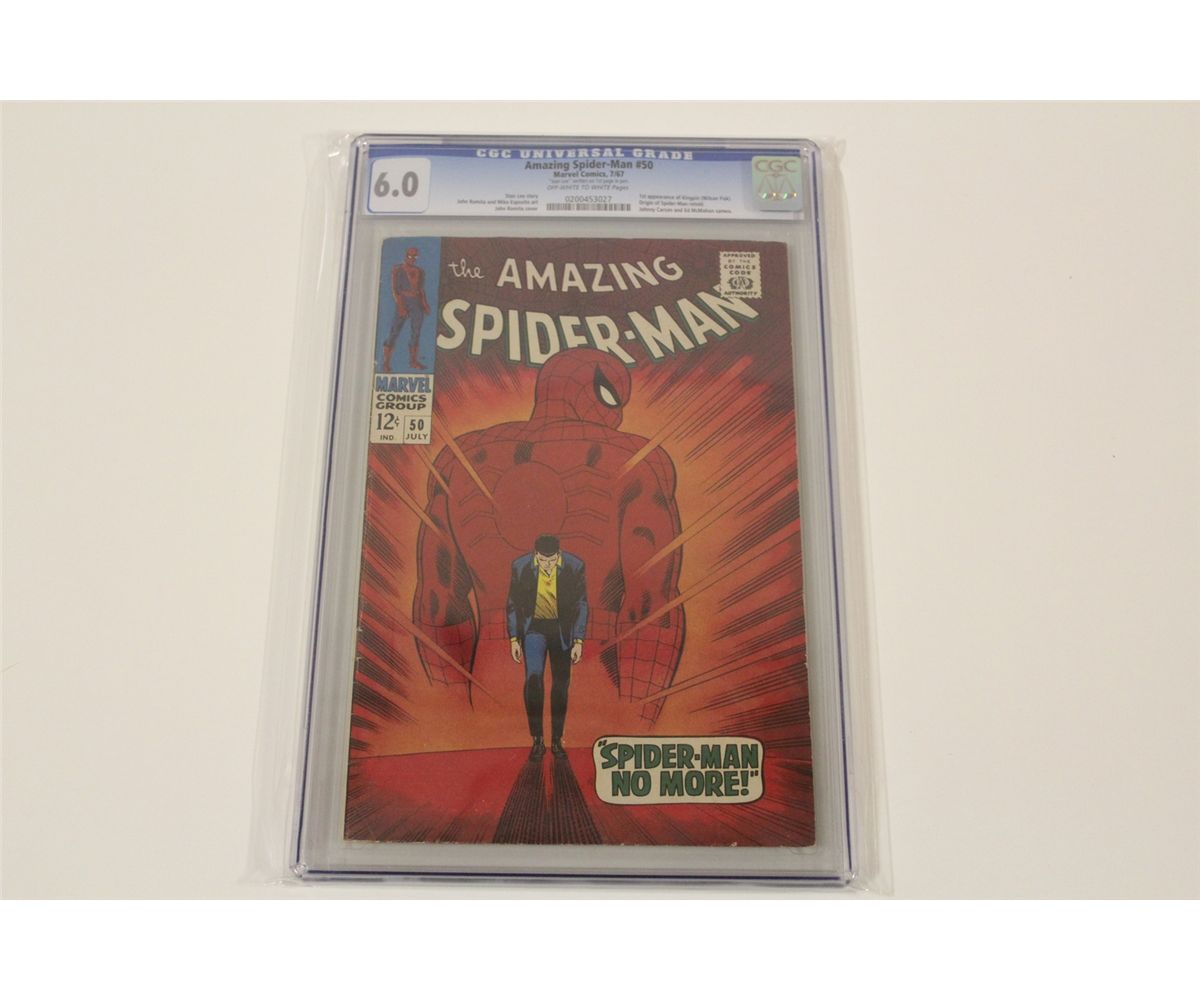 AMAZING SPIDER-MAN #50 CGC 6.0 (FN) (1967) OFF-WHITE TO WHITE PAGES, KEY ISSUE - 1ST APP. KINGPIN, CLASSIC COVER, ORIGIN RETOLD. A CGC 6.0 COPY SOLD FOR $325 IN MARCH 2013 AS TRACKED THROUGH THE GPA