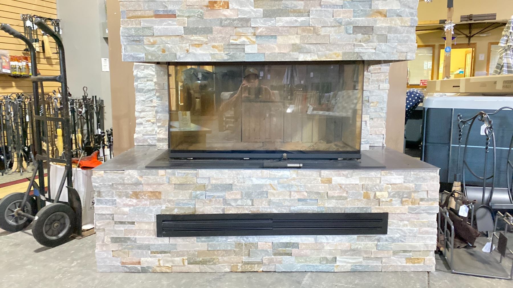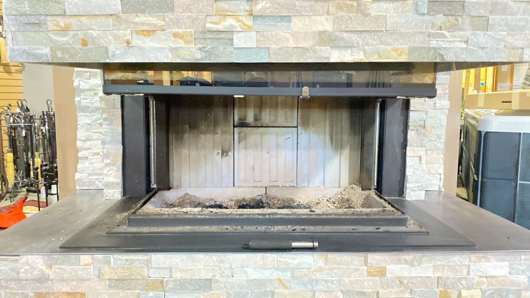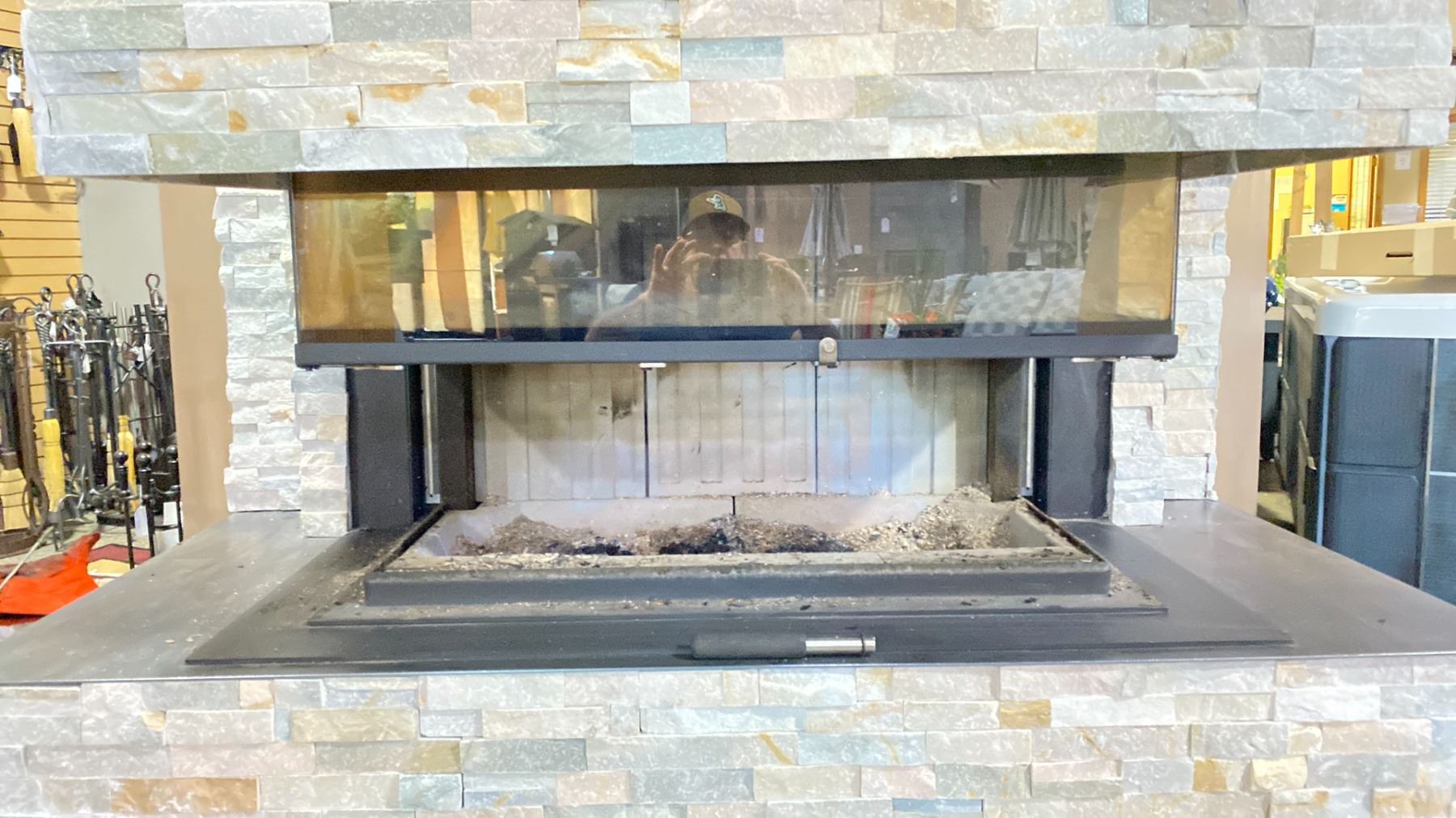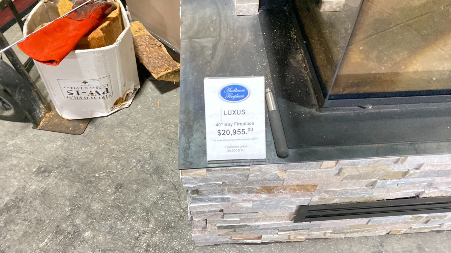 AMBIANCE FIREPLACES LUXUX 40" BAY FIREPLACE WITH LOUVRES AND HOT AIR GRAVITY SYSTEM. GUILLOTINE GLASS, 49,000 BTU. DEMO. USES REAL WOOD. BUYER HAS THE OPTION OF TAKING THE ROCK AROUND THE DISPLAY IF THEY WANT TO REMOVE. INC ALL CHIMNEY PARTS. THE EXTERNAL VENTING BRINGS IN COLD BELOW AND DISPERSES THE HEAT ABOVE. GLASS WILL PIVOT OUT FOR CLEANING. RETAILS $21,000 *REMOVAL TUE OR WED - REQUIRES TOOLS TO DISMANTLE - TILES NEED TO BE REMOVED TO MOVE FIREPLACE