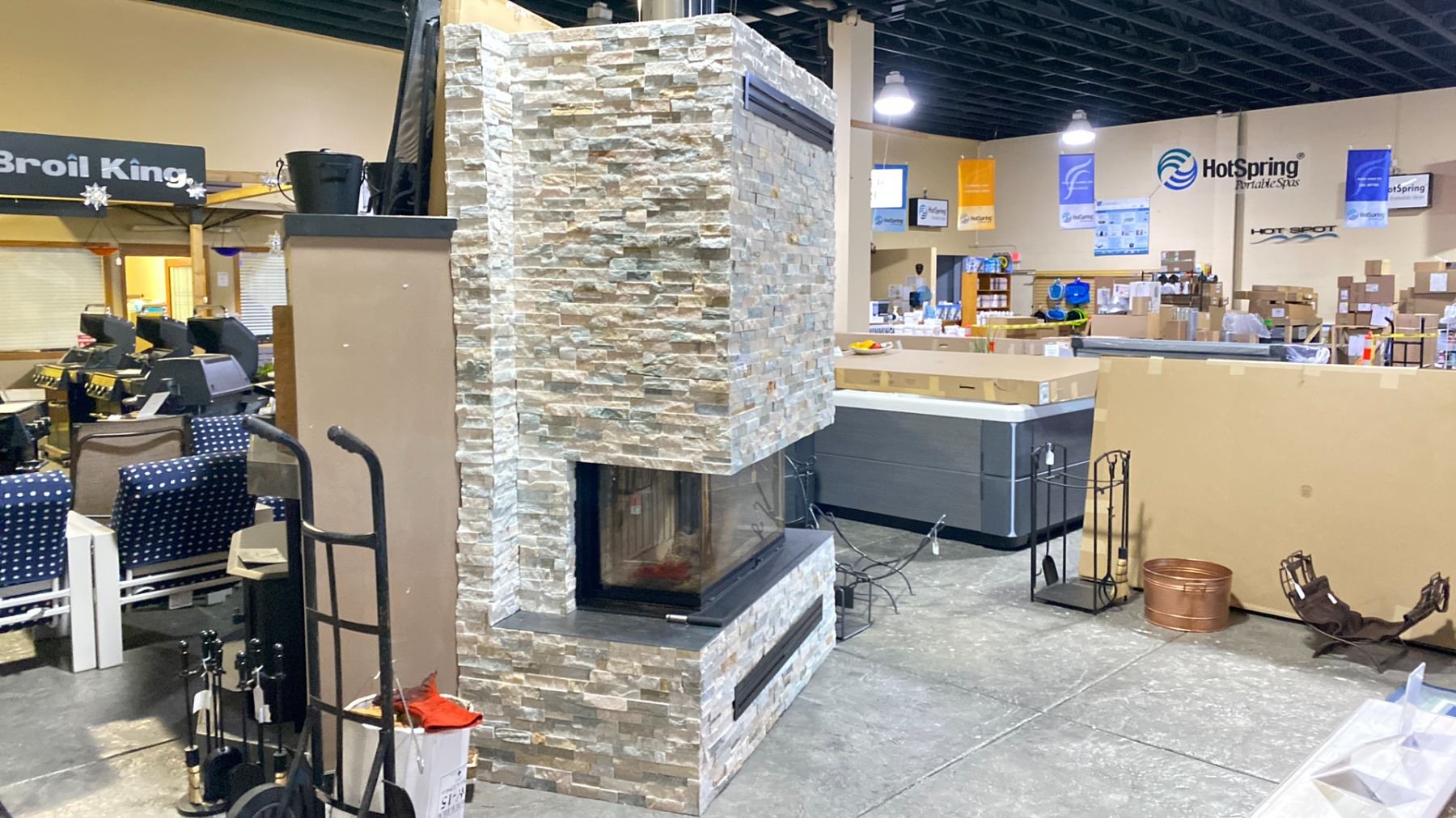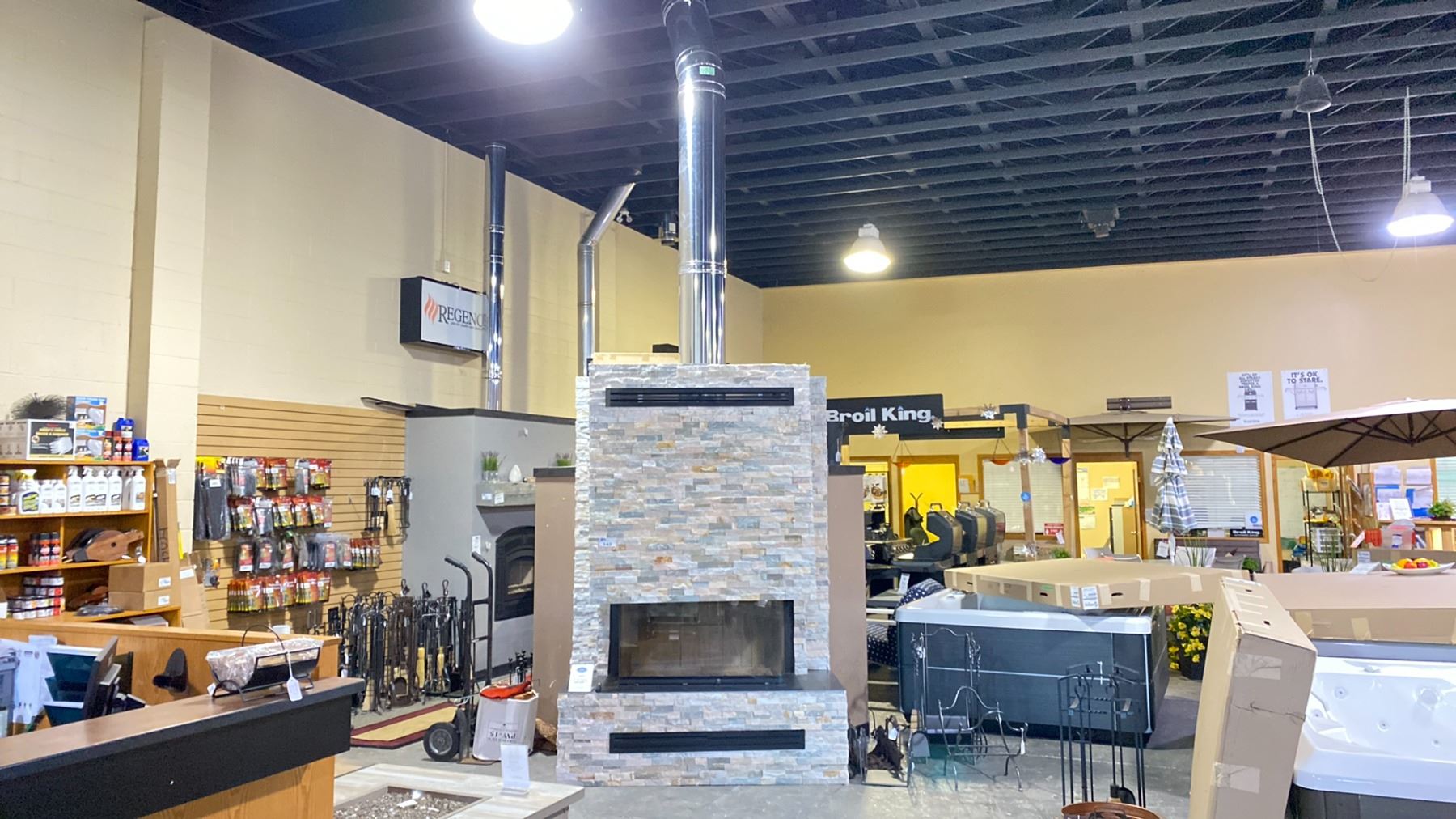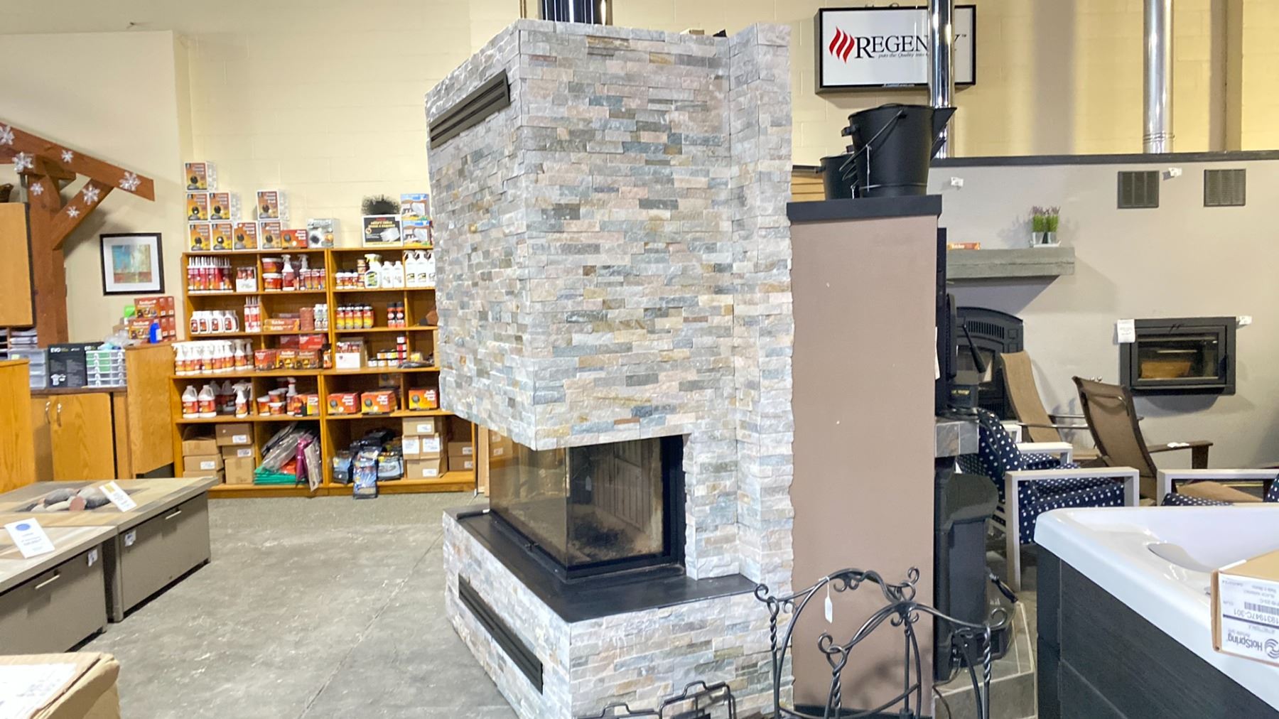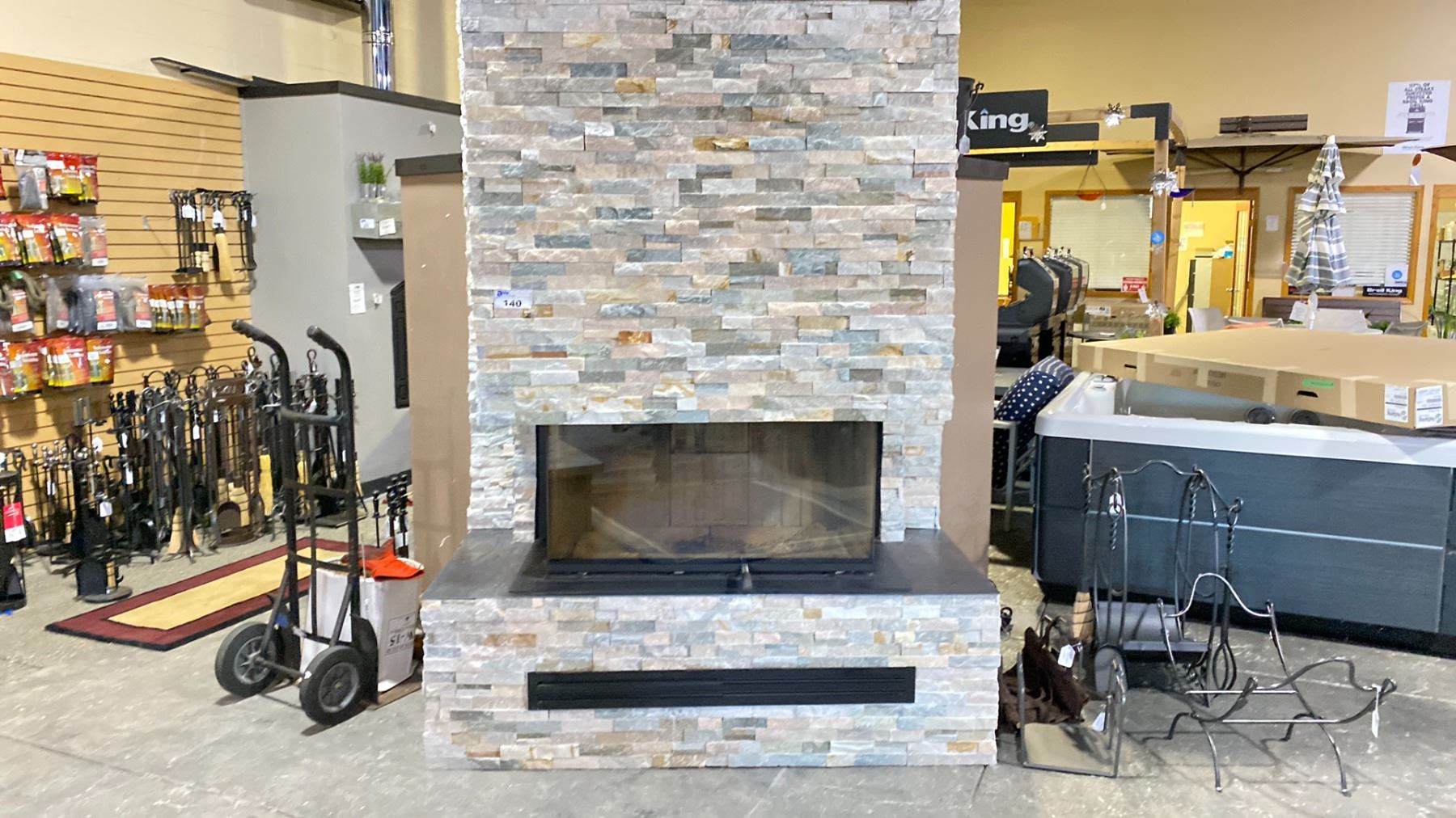 AMBIANCE FIREPLACES LUXUX 40" BAY FIREPLACE WITH LOUVRES AND HOT AIR GRAVITY SYSTEM. GUILLOTINE GLASS, 49,000 BTU. DEMO. USES REAL WOOD. BUYER HAS THE OPTION OF TAKING THE ROCK AROUND THE DISPLAY IF THEY WANT TO REMOVE. INC ALL CHIMNEY PARTS. THE EXTERNAL VENTING BRINGS IN COLD BELOW AND DISPERSES THE HEAT ABOVE. GLASS WILL PIVOT OUT FOR CLEANING. RETAILS $21,000 *REMOVAL TUE OR WED - REQUIRES TOOLS TO DISMANTLE - TILES NEED TO BE REMOVED TO MOVE FIREPLACE