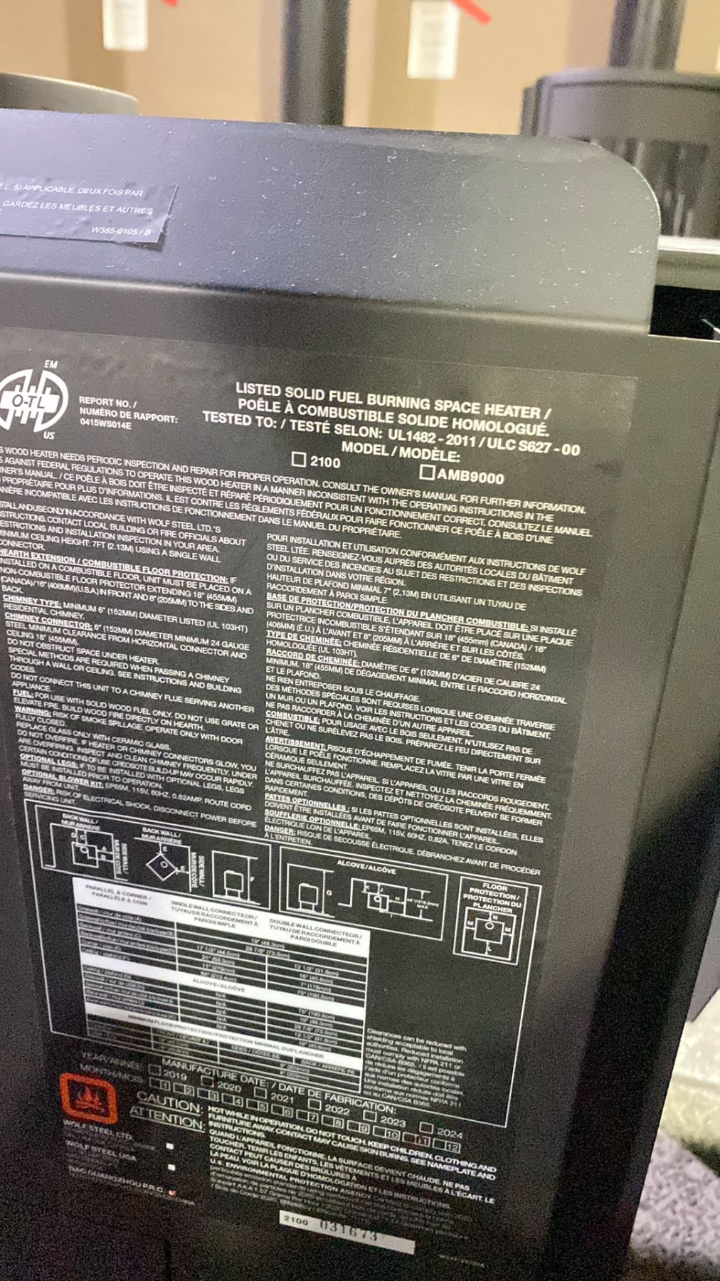 AMBIANCE WOLF STEEL OUTLANDER 15 WOODSTOVE. MATTE BLACK. 1.57 G/H. HEATS FROM 600-1800 SQ FT. 20" MAX LOG LENGTH