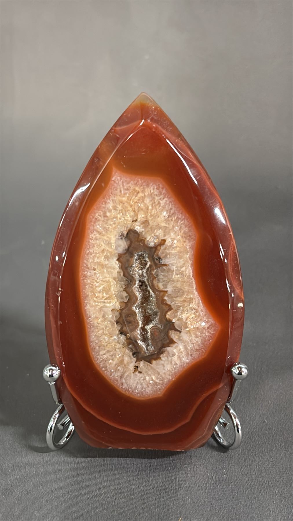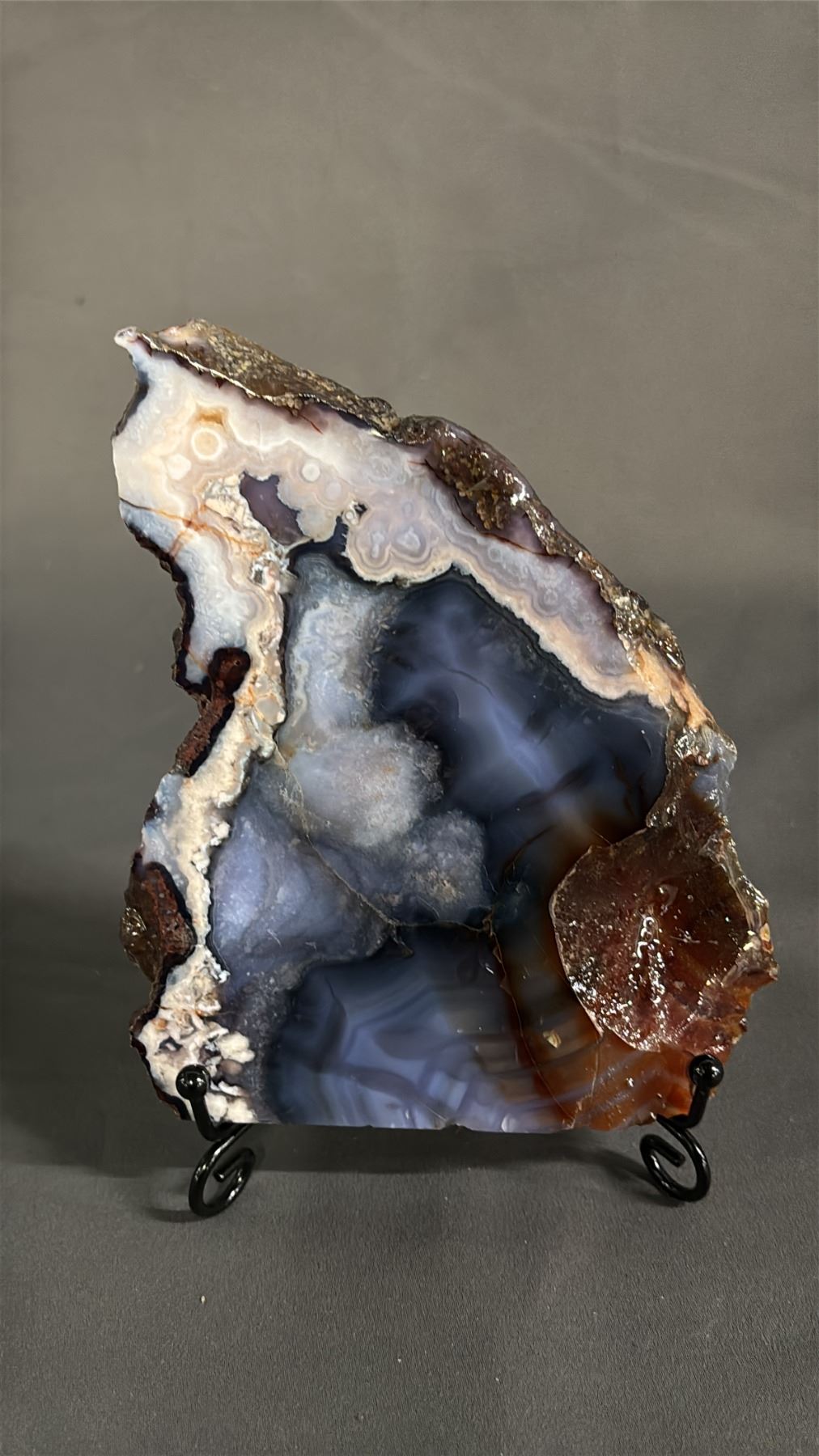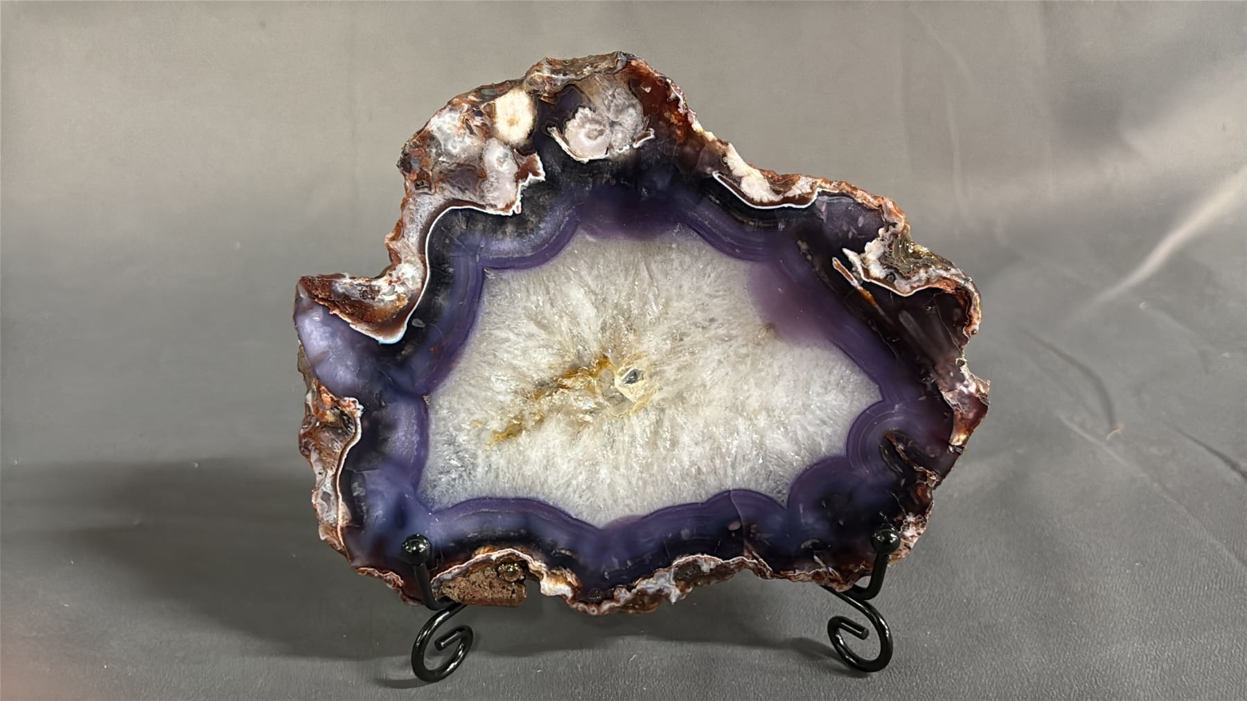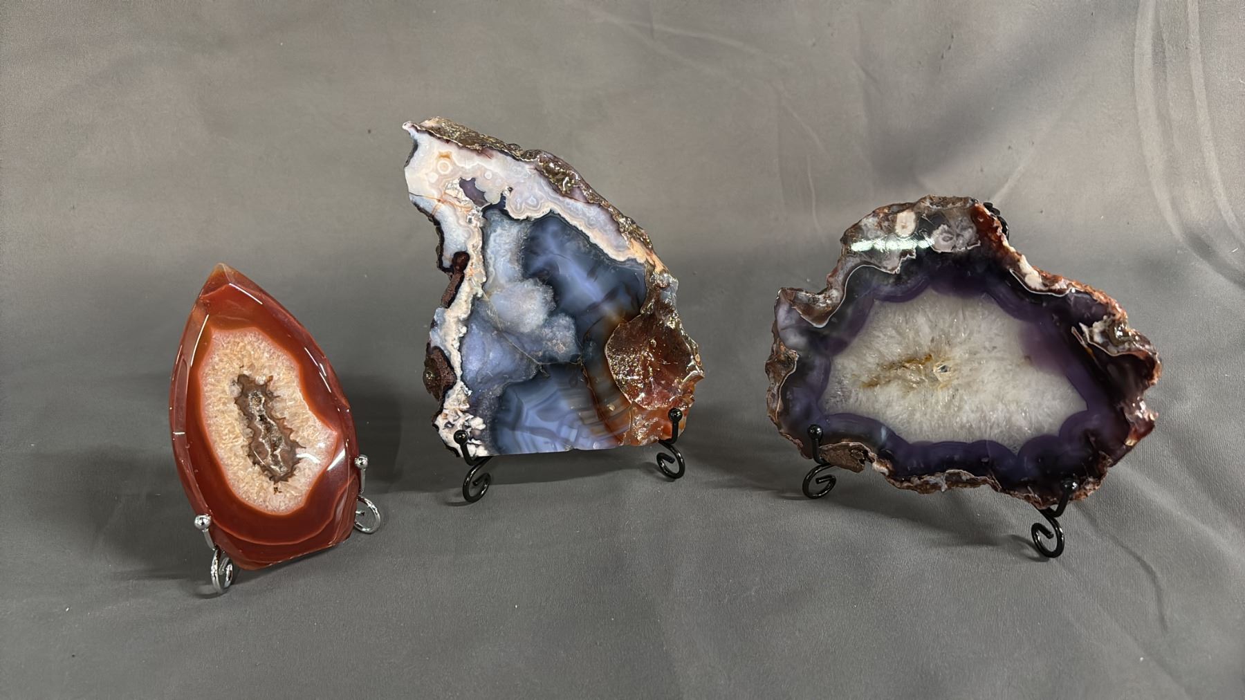 AMETHYST AGATE GEODE SLICE, BLUE FLOWER AGATE SLICE & CARNELIAN DRUZY SLICE: ALL WITH STANDS