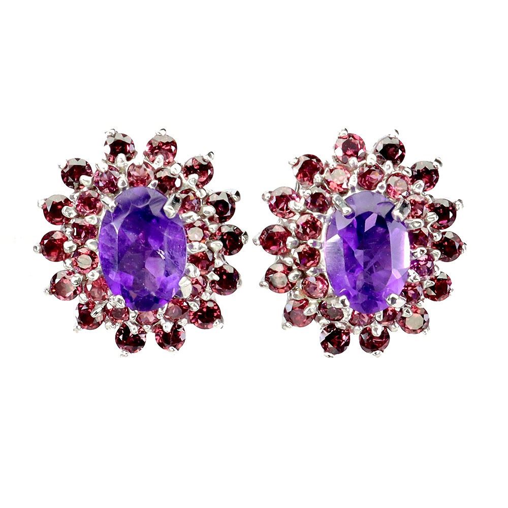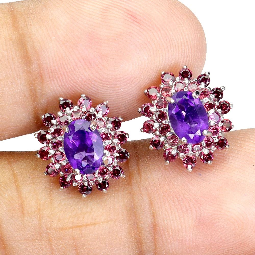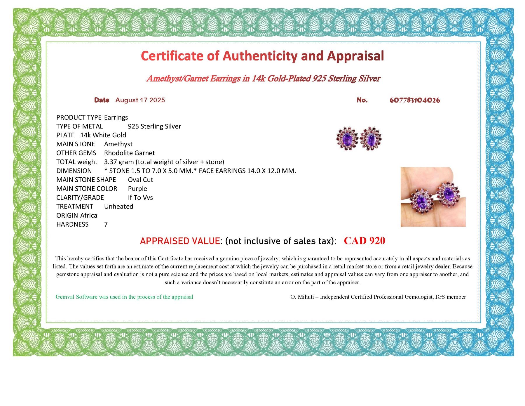 AMETHYST AND RHODOLITE GARNET EARRINGS IN 14K WHITE GOLD-PLATED 925 STERLING SILVER APPRAISED REPLACEMENT VALUE CAD 920 – DIGITAL CERTIFICATE