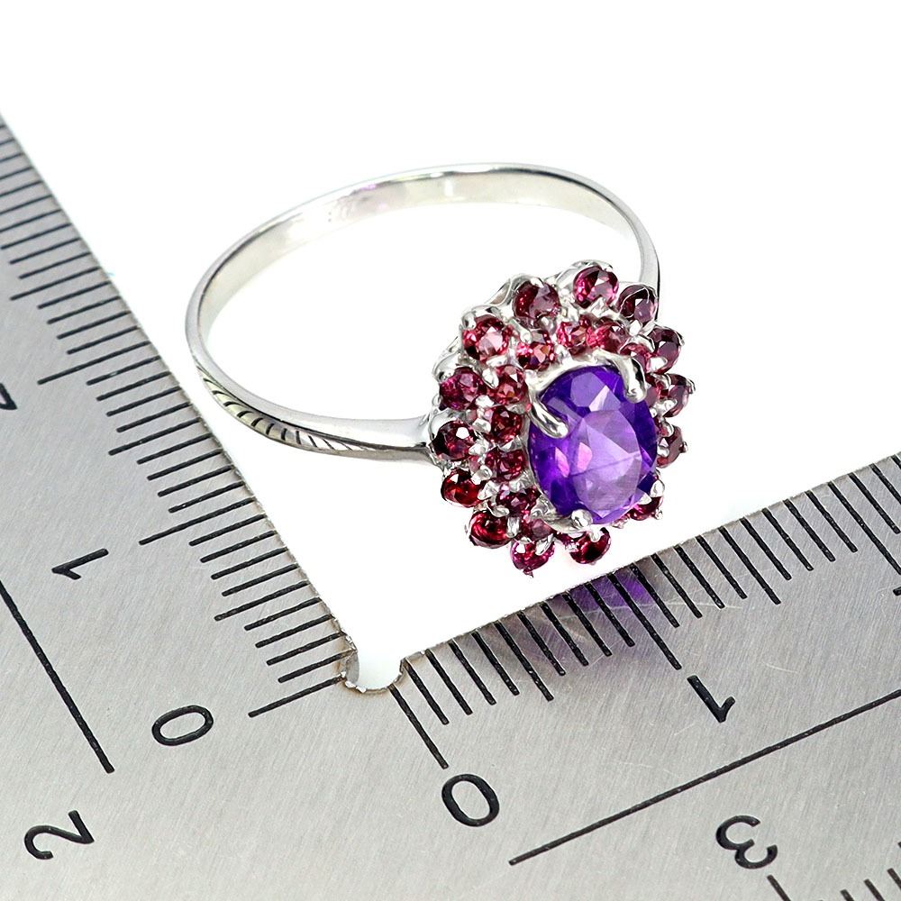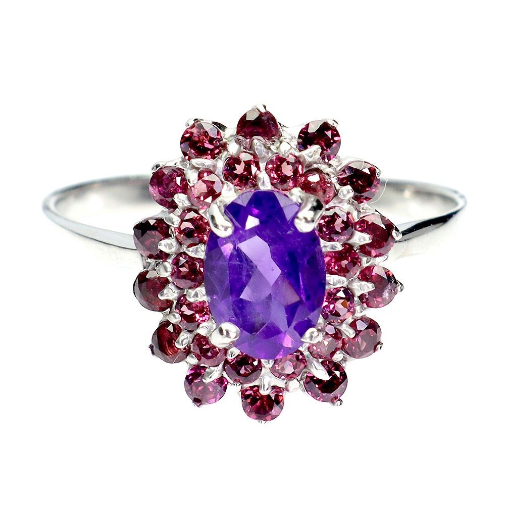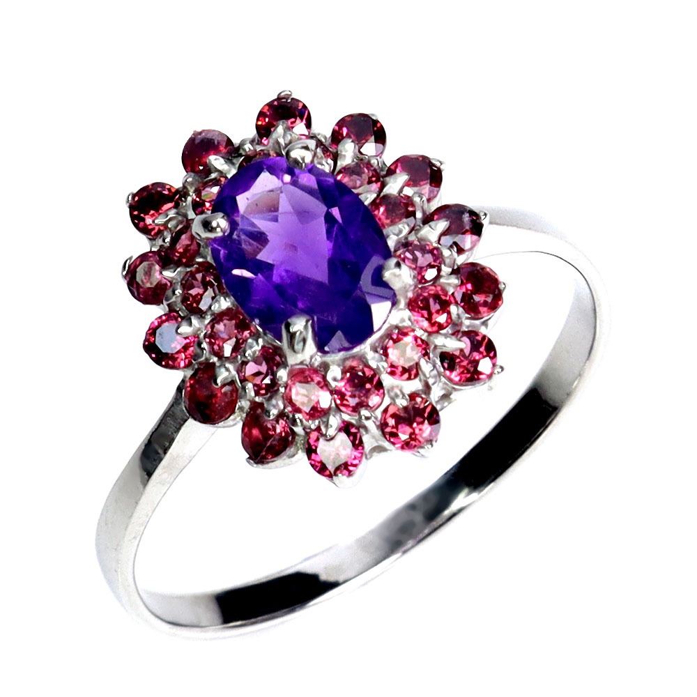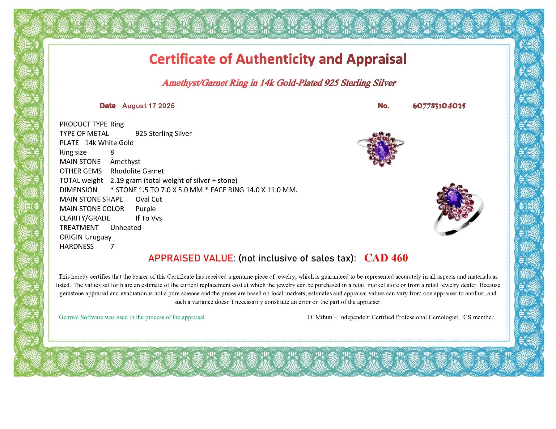 AMETHYST AND RHODOLITE GARNET RING IN 14K WHITE GOLD-PLATED 925 STERLING SILVER SIZE 8 - APPRAISED REPLACEMENT VALUE CAD 460 – DIGITAL CERTIFICATE
