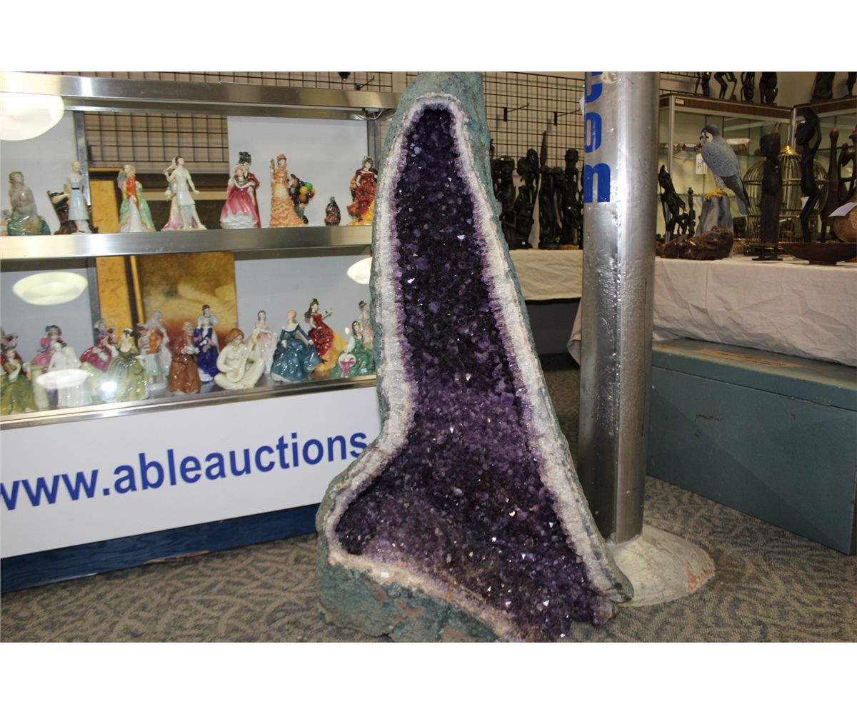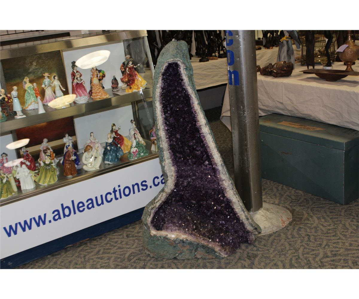 AMETHYST GEODE 48" HIGH 28" WIDE AT THE BASE. WEIGHS APPROX 500 LBS AND HAS A CRACK IN THE BACK SIDE. A LARGE CRATE IS AVAILABLE FOR SHIPPING