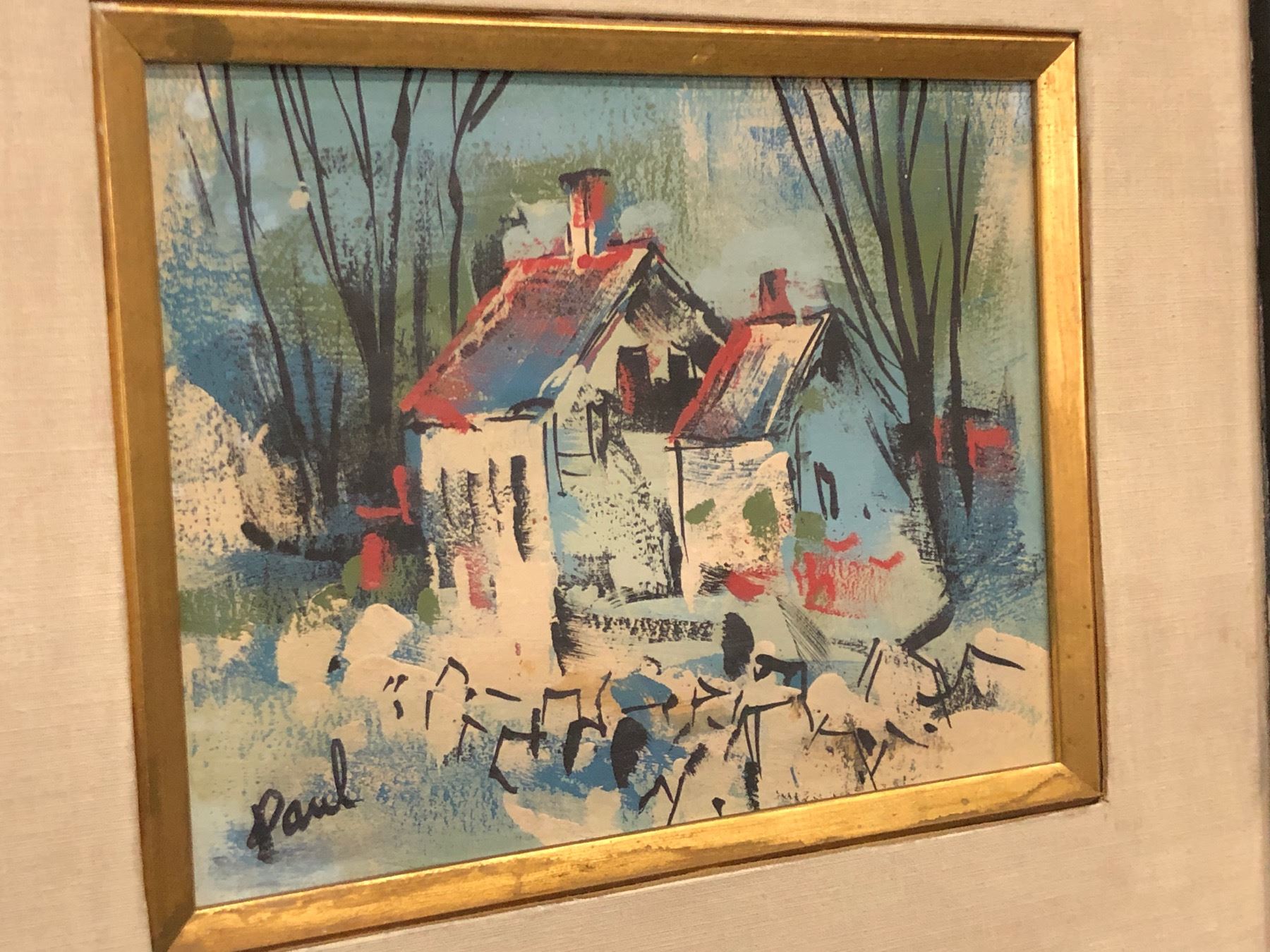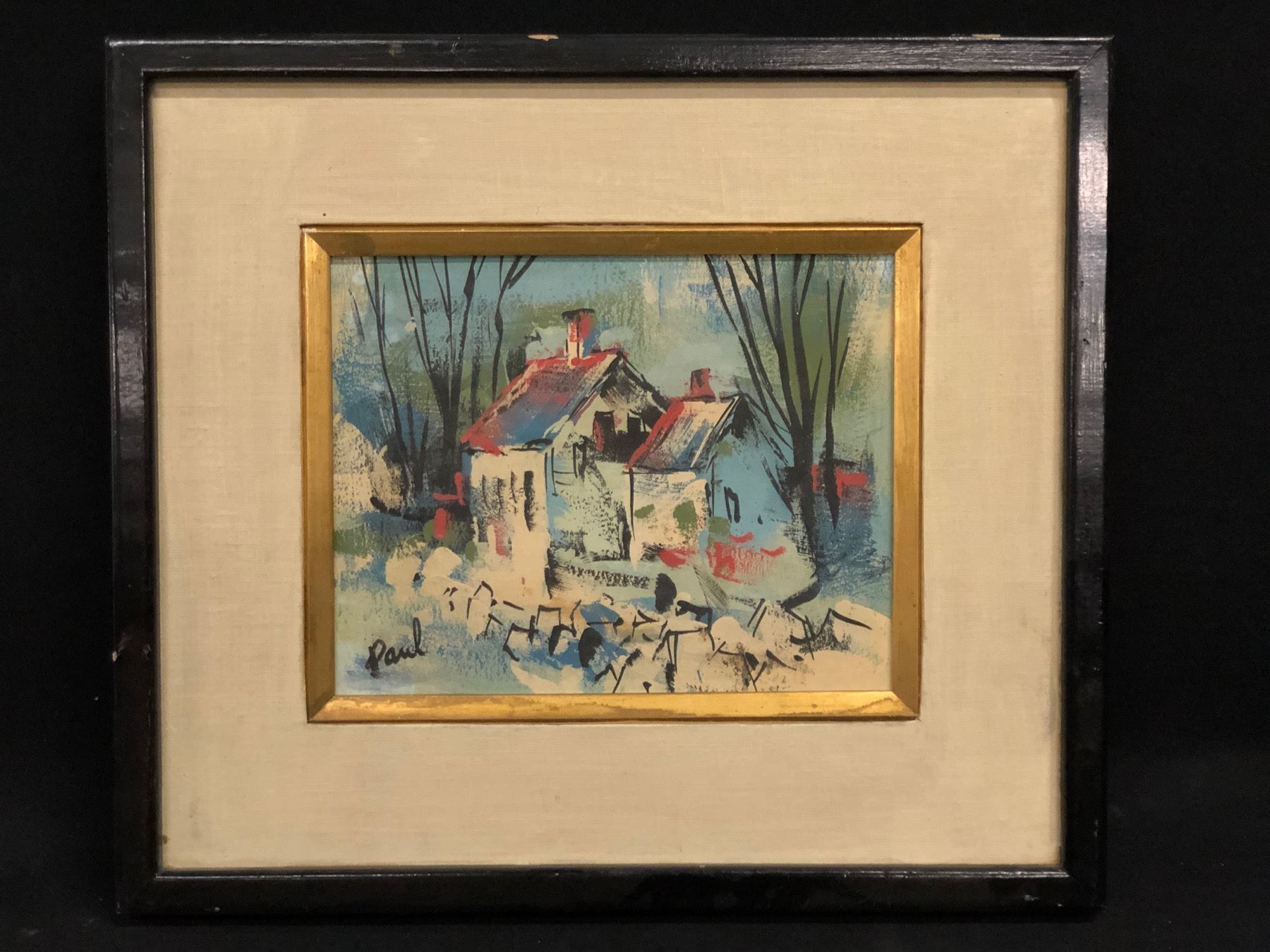 ANDREW PAUL, ORIGINAL FRAMED OIL ON BOARD PAINTING, C. 1950S, SIGNED LOWER LEFT, ABSTRACT COTTAGE SCENE, 14.5'' X 16.5''