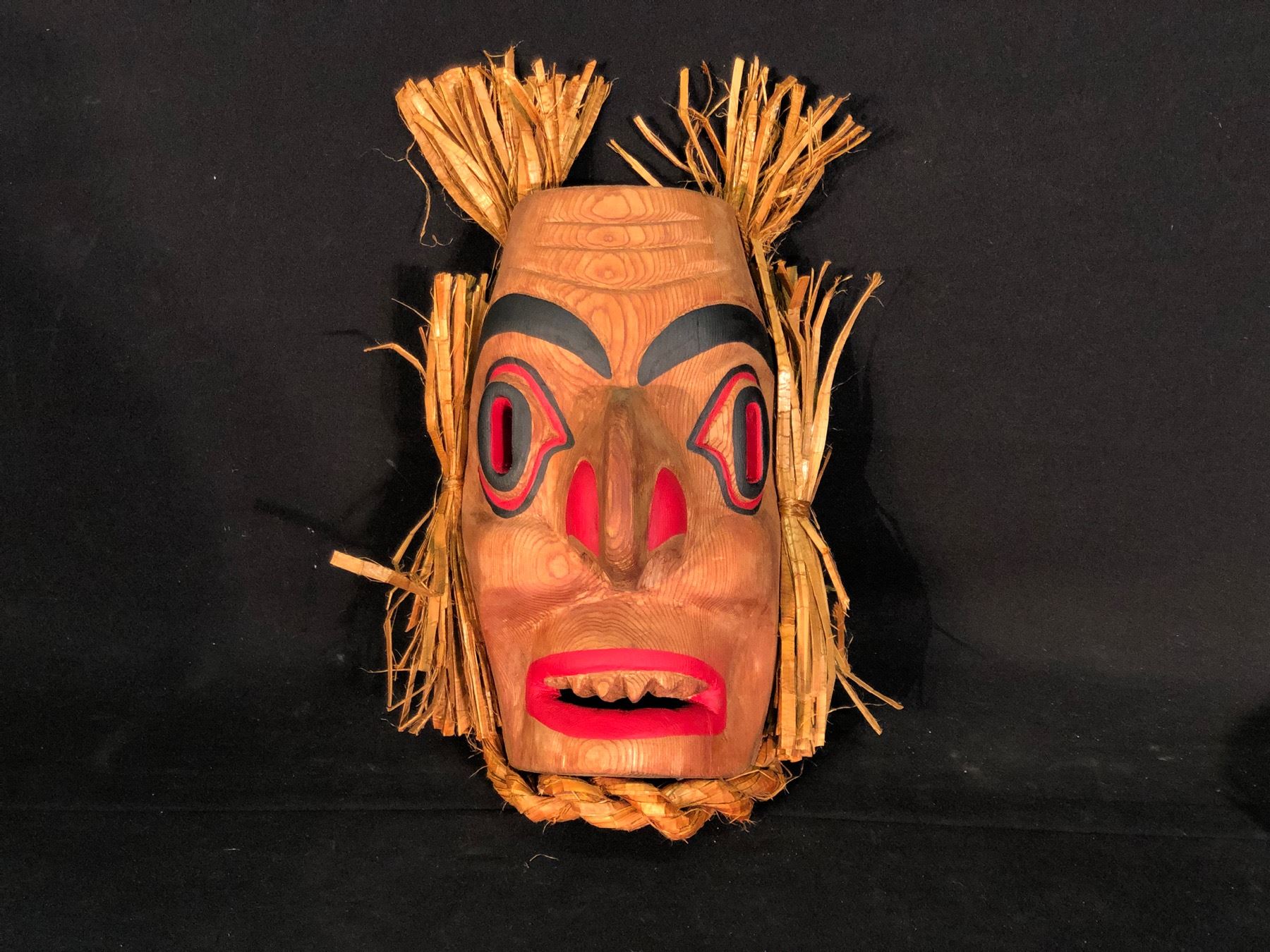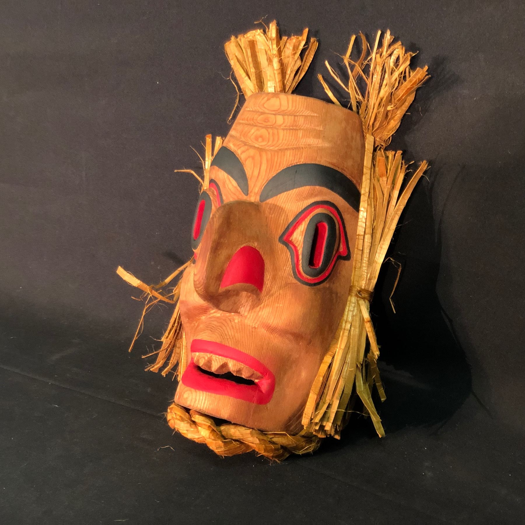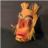 ANDY WESLEY OF TSU-ECH FIRST NATION, HAND CARVED AND PAINTED WILDMAN MASK WITH CEDAR BARK ACCENTS, 17'' T X 10'' W INC. CEDAR BARK, SIGNED ON BACK BY ARTIST