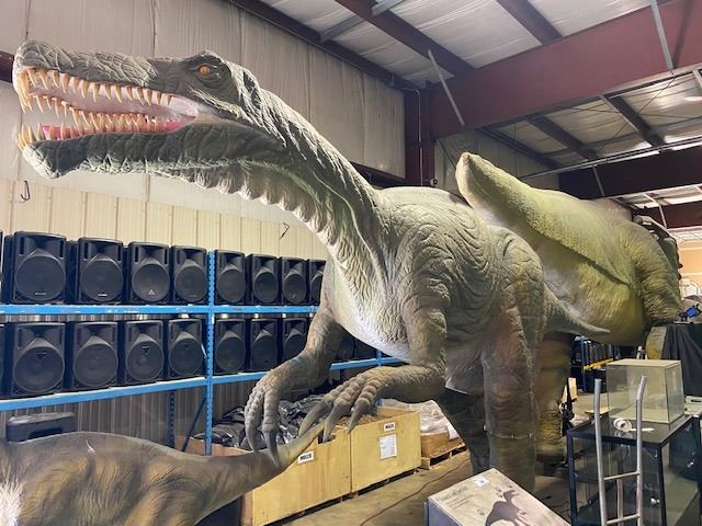 ANIMATRONIC BARYONYX CRETATIOUS PERIOD DINOSAUR LIVED IN ENGLAND 125 - 130 MILLION YEARS AGO MEASURES 240" LONG X 41" WIDE X 140" TALL. APPROX. WEIGHT 270 KG. LEGS REMOVE FOR SHIPPING, C/W CUSTOM CONTROLLER, SPEAKER, MOTION SENSOR & ALL REQUIRED WIRING APPROX 595LBS
