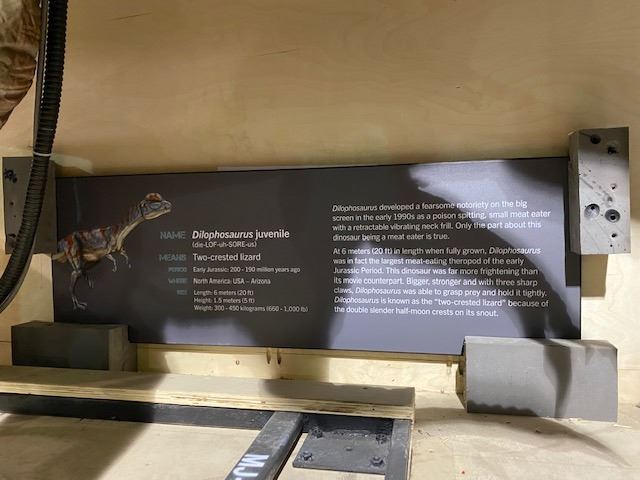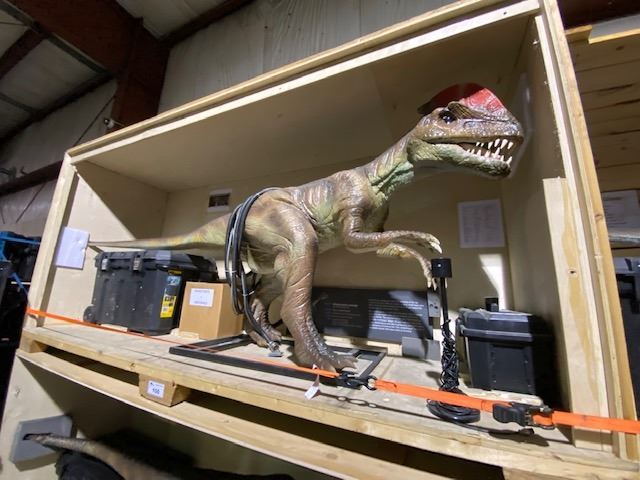 ANIMATRONIC DILOPHOSAURUS EARLY JURASSIC PERIOD DINOSAUR IN TRANSPORT CRATE LIVED IN NORTH AMERICA 193 MILLION YEARS AGO MEASURES 120" LONG X 36" WIDE X 59" TALL. APPROX. WEIGHT 325 KG. READY FOR SHIPPING, C/W CUSTOM CONTROLLER, SPEAKER, MOTION SENSOR, SPARE PARTS, TOOLS, GRAPHICS & ALL REQUIRED WIRING APPROX 716LBS
